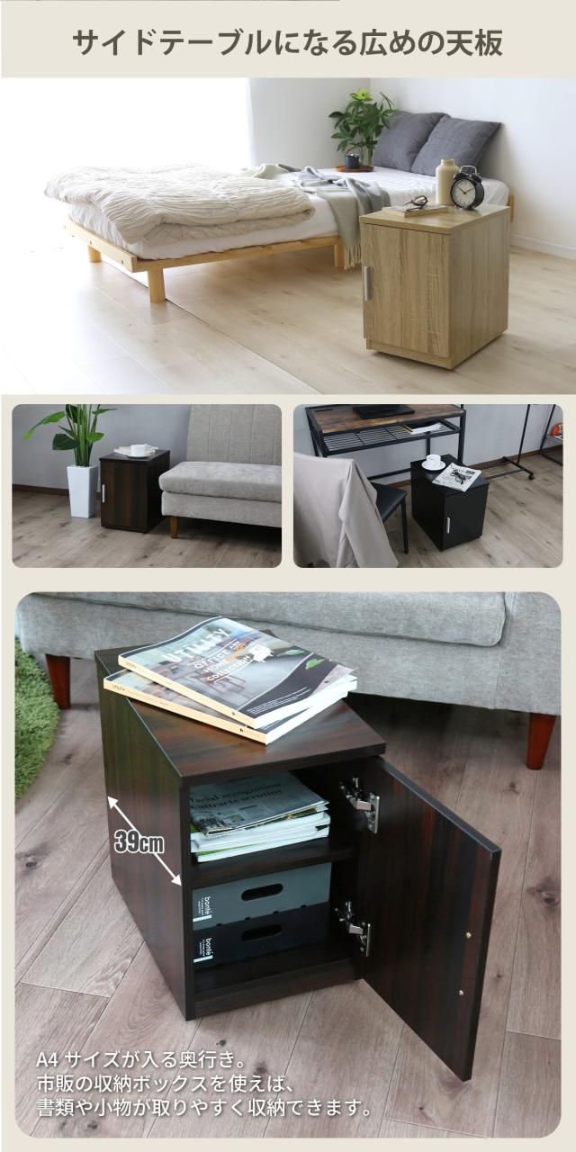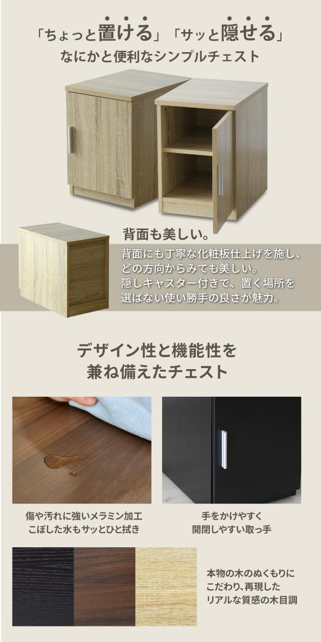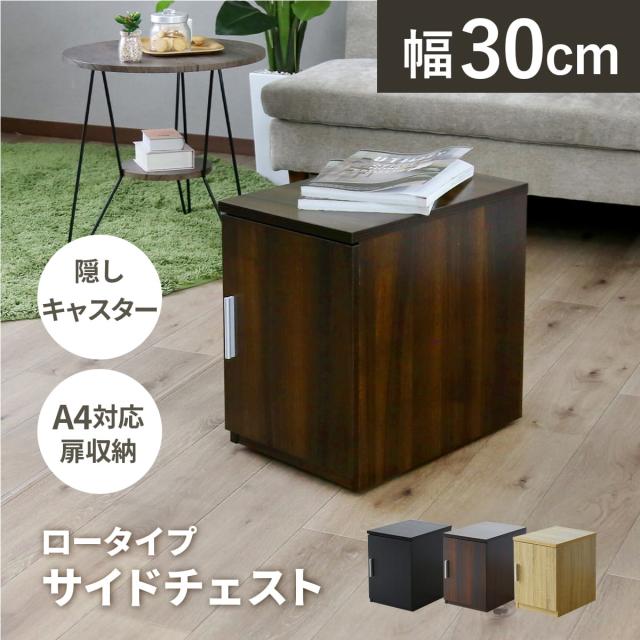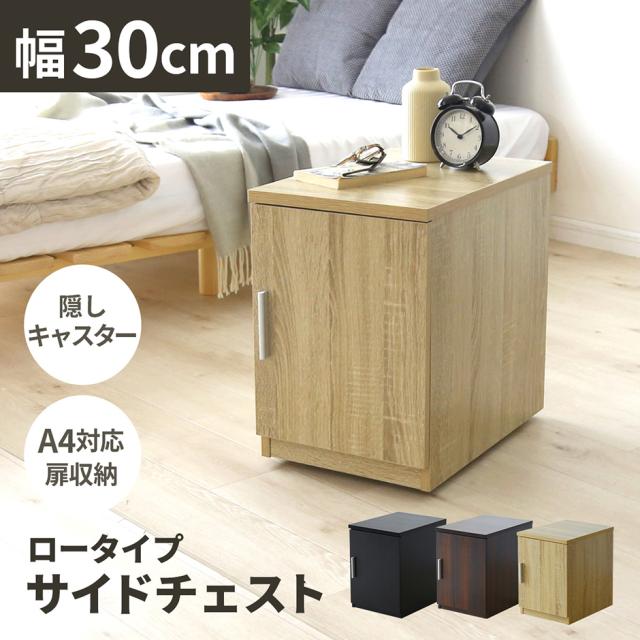 幅30cmのコンパクトサイズながら、使いやすさと収納力を兼ね備えた木製サイドチェスト。デスクワゴンやナイトテーブルとして活躍します。コンパクトで圧迫感がなく、お部屋の風景に自然に溶け込むのも魅力。ブラック・ウォルナット・オークの3色展開。隠しキャスター付きで移動もスムーズ、扉収納には防災グッズや書類ボックスを入れてすっきり片付けられます。天板はちょい置きスペースとして便利。デザイン性と機能性を両立させたシンプルチェストです。