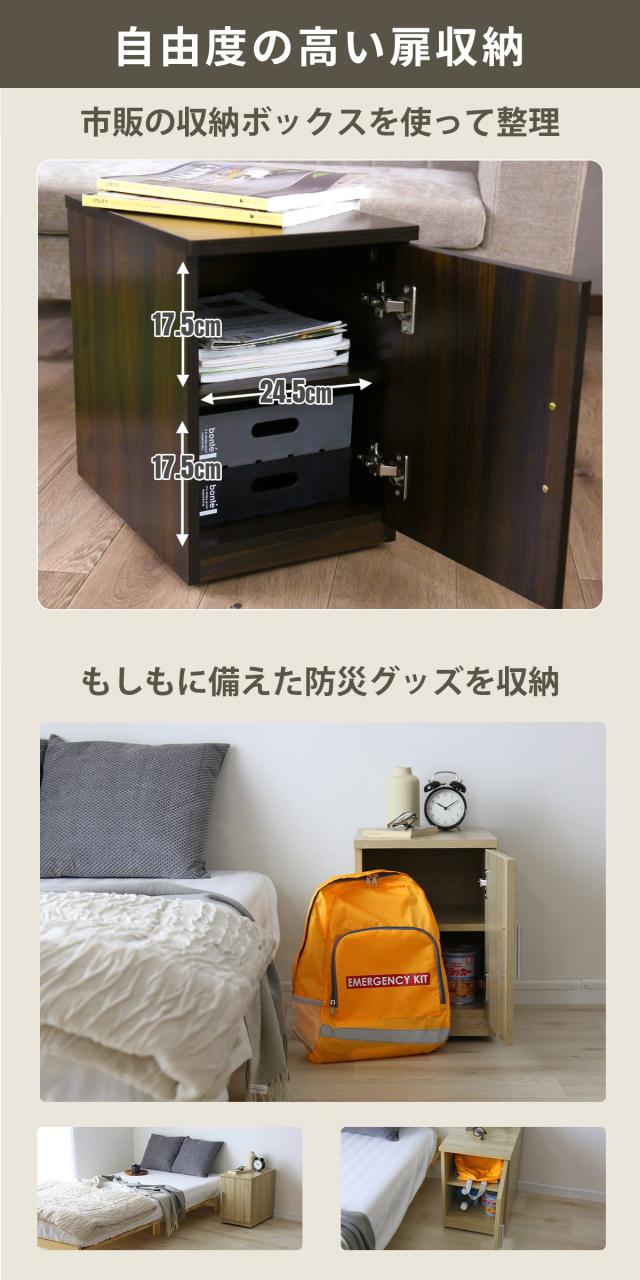 扉収納は中身をさっと隠せる仕様。防災グッズや市販の収納ボックスを組み合わせて書類や小物を整理できるなど、使い方の自由度が高いのが特長です。来客時には生活感を隠してすっきり見せられるのも嬉しいポイント。たっぷり奥行きがあるため、思った以上に収納でき、日常使いから非常時の備えまで幅広く対応します。