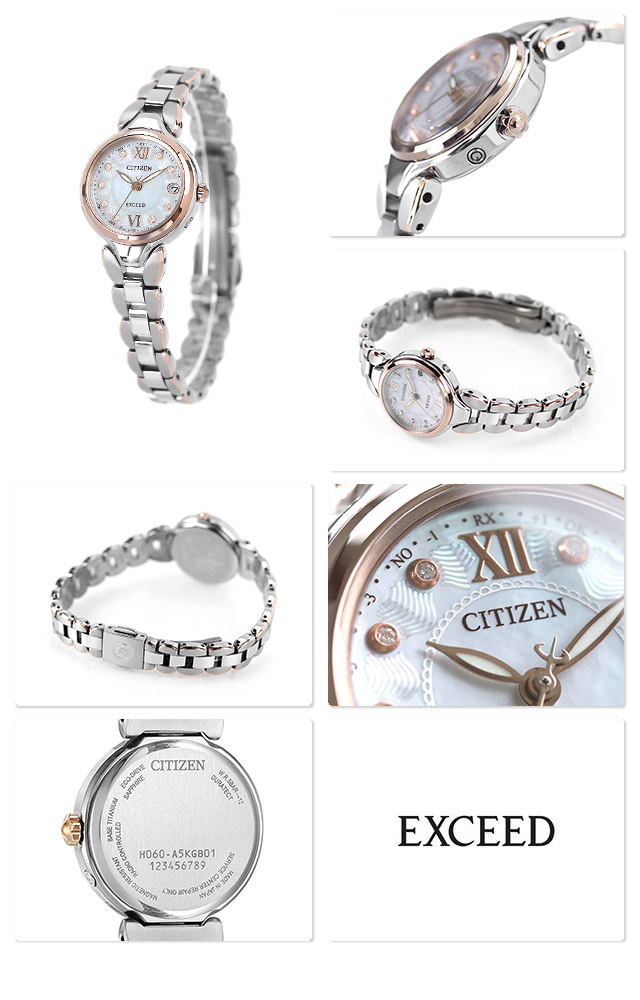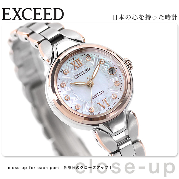 正規品 7年保証キャンペーン 送料無料 シチズン エクシード 電波ソーラー 日本製 エコ・ドライブ電波 レディース 腕時計 ES9474-67W CITIZEN EXCEED Titania Happy Flight アナログ ホワイトシェル×ピンクゴールド ◆確かな品質と洗練されたデザイン。大人のためのドレスウオッチ、シチズン EXCEED(エクシード)。フェミニンで華やかなデザインが人気のダイヤモンド入りフラワーバンドモデルに、ハッピーフライト機能を搭載しました。ケースは透明感のあるツートン。肌なじみよく、主張しすぎないカラーがさりげない上品さを演出します。丸型はドレスのスカートの広がりをイメージした白蝶貝彫刻の文字盤を採用しました。スーツスタイルから、休日の大人カジュアルまで幅広く合わせることができます。 発売日:22年5月発売