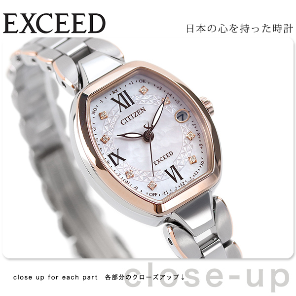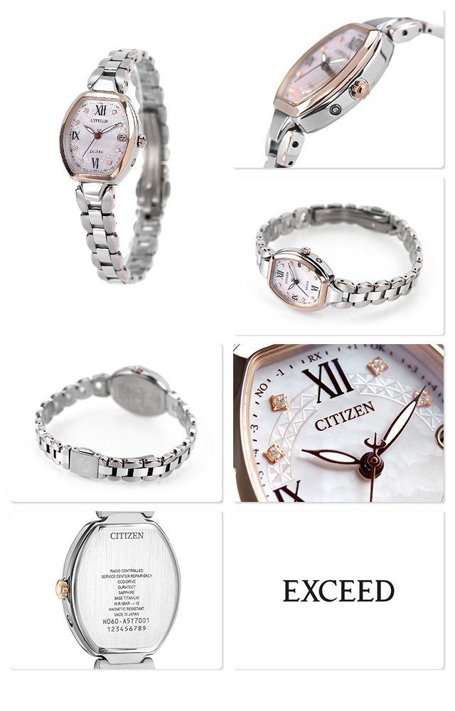 正規品 7年保証キャンペーン 送料無料 シチズン エクシード 電波ソーラー 日本製 エコ・ドライブ電波 レディース 腕時計 ES9484-55W CITIZEN EXCEED Titania Happy Flight アナログ ピンクシェル×ピンクゴールド ◆確かな品質と洗練されたデザイン。大人のためのドレスウオッチ、シチズン EXCEED(エクシード)。フェミニンで華やかなデザインが人気のダイヤモンド入りフラワーバンドモデルに、ハッピーフライト機能を搭載しました。ケースは透明感のあるツートン。肌なじみよく、主張しすぎないカラーがさりげない上品さを演出します。切子グラスや教会のモザイクタイルをイメージした白蝶貝彫刻の文字盤を採用しました。トノー型のケースもポイント。スーツスタイルから、休日の大人カジュアルまで幅広く合わせることができます。 発売日:22年5月発売