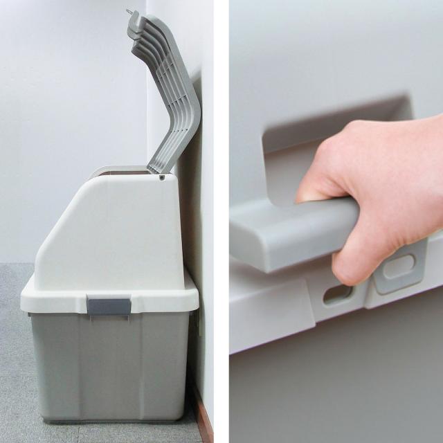 片手で簡単に開閉が出来るワイドな取手付きです。壁際に置いたままフタカバーの開閉が出来るので、置く場所を選ばずに中身が取り出せます。