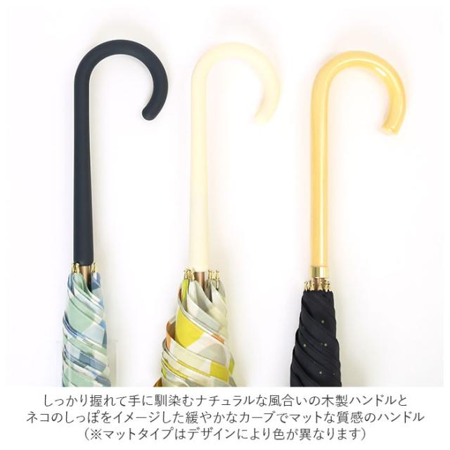 | 商品説明 | ・軽くて丈夫で持ちやすい!「Wpc.」の「High Standard長傘」がリニューアルして新登場。(親骨58cmタイプ) ・軽量でフェミニンなデザインでありながら、傘生地を広げた時には親骨58cmとしっかりサイズ。 ・開閉時に指先や爪を挟むのを防止する安全ろくろ付きで、スムーズに開閉できる手開きタイプ。 ・親骨に弾力性があり折れにくいグラスファイバー素材を使用しているので、風が少し強めの日でもちゃんとさせて安心。 ・一般の傘と比べて長期的に継続する撥水加工済み!さらに紫外線防止効果もあり、雨の日だけでなく日差しの強い日も使える晴雨兼用傘。(※紫外線遮蔽率…淡色:約80%、濃色:約90%。色の濃淡により異なります。) ・軽量なアルミ素材を使用した中棒は、シャンパンゴールドのカラー使いで細部までおしゃれに♪ ・傘生地を留めるバンドは、バチンっと留めやすいスナップボタン式。 ・手元ハンドルは持ちやすさを追求した、少し太めの設計。 ・しっかり握れて手に馴染むナチュラルな風合いの木製ハンドルと、ネコのしっぽをイメージした緩やかなカーブデザインでマットな質感のハンドルをご用意。(※マットタイプはデザインにより持ち手の色が異なります。) |
