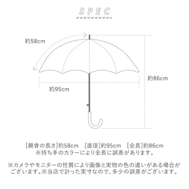| サイズ | [親骨の長さ]約58cm/[直径]約95cm/[全長]約86cm ※持ち手のカラーにより全長の長さに誤差があります。 ※サイズは当店計測の実寸サイズです。実際の商品ならびにメーカー表記サイズとは多少の誤差が生じる場合がございます。あらかじめご了承ください。 |