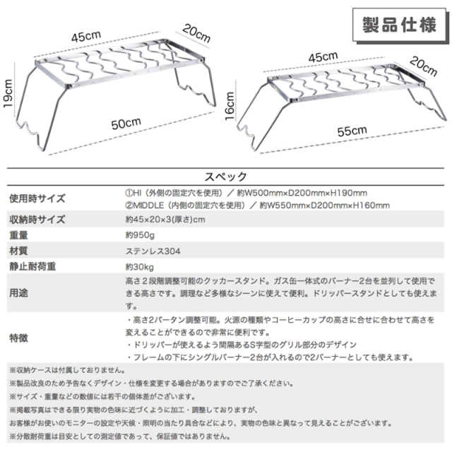 用途:高さ2段階調整可能のクッカースタンド。木炭や薪を使ってのアウトドア調理や、バーナーを併用しての調理など多様なシーンに使えて便利。ドリッパースタンドとしても使えます。
