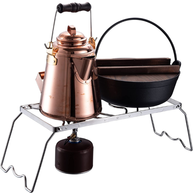クッカースタンドとは、アウトドア用の調理器具(クッカー)を乗せる台のこと。ゴトクとも呼ばれ、やかんや鍋、焼き網なども乗せることができ、下にバーナーを設置して調理します。バーナーの代わりに焚き火などの直火料理もできます。調理に使わないときは、簡易テーブルや物置きにもなり、キャンプに一台あると便利なアイテムです。