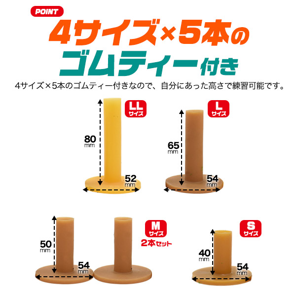 4サイズ×5本のゴムティー付きなので、自分にあった高さで練習可能です。