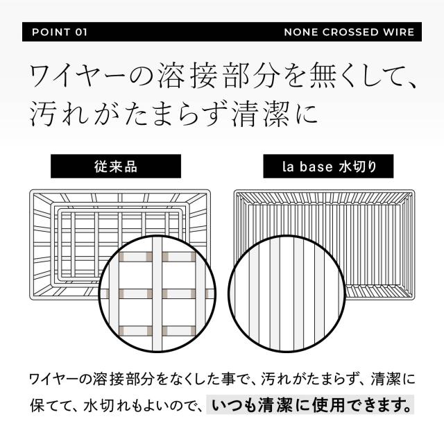 la baseのスリムサイズのステンレス水切りかごです。かごの深さを浅くすることで食器の出し入れがしやすく、ワイヤーはフラットで間隔も細かいのでお皿も立てやすくグラスも安定して置くことができます。ワイヤーの溶接部分を無くすことで汚れがたまりにくく、清潔に保つことができお手入れも簡単です。水気の多いシンク周りでも安定するよう足には専用のシリコーンゴムが付属しております。