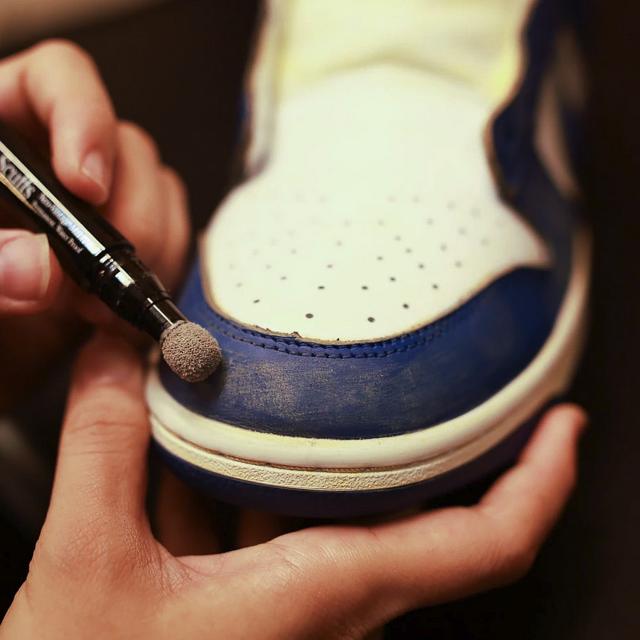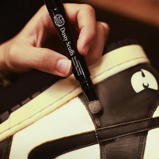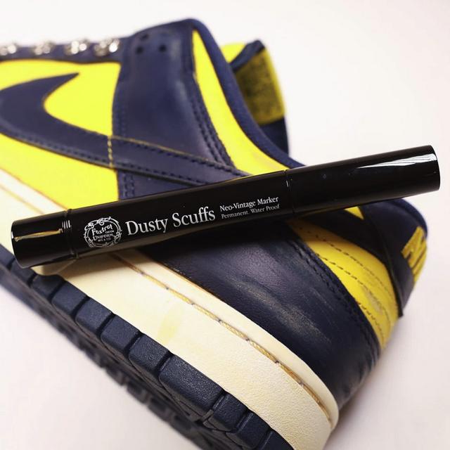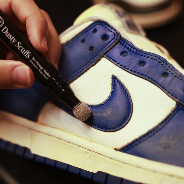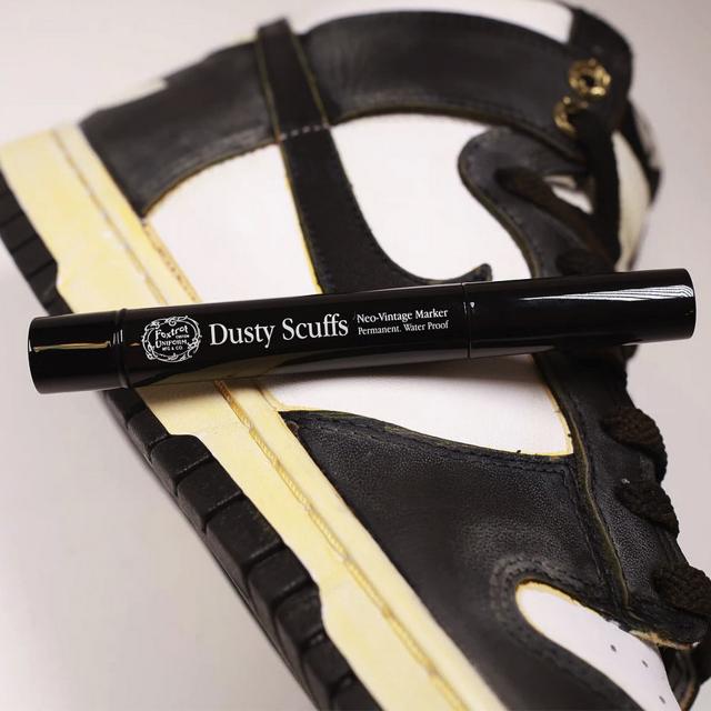 FOXTROT UNIFORMのヴィンテージマーカー「DUSTY SCUFFS」。スニーカーの表面についている汚れをふき取ったら、スポンジチップを使用し、スニーカーの表面に何年も履いたかのようなほこりっぽさや傷がついたようなヴィンテージ感を、スニーカーを傷つけることなく表現することが可能です。速乾性に優れているので、塗り終わって少し乾かすだけでスニーカーに馴染みます。レザーや布、スエードなど様々な素材に対応することが可能で、自分だけのオリジナルのスニーカーを作ることができます。