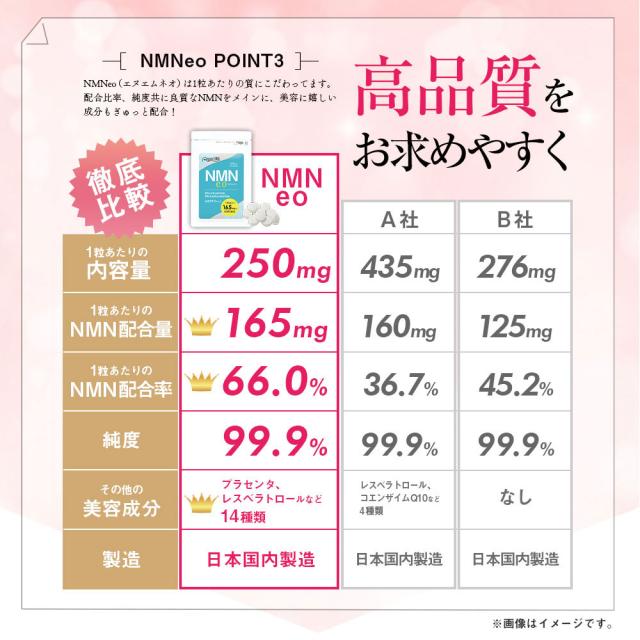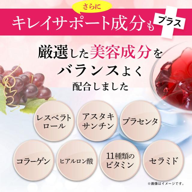 | 原材料名 | β-ニコチンアミド・モノヌクレオチド(国内製造)、でん粉、硬化ナタネ油、リンゴンベリー抽出物(レスベラトロール含有)、豚プラセンタ抽出物、コラーゲンペプチド、トウモロコシ抽出物/ヒアルロン酸、ヘマトコッカス藻色素、ビタミンC、抽出ビタミンE、ナイアシン、パントテン酸カルシウム、ビタミンB1、ビタミンB6、ビタミンA、ビタミンB2、葉酸、ビタミンD、ビタミンB12 、(一部に豚肉、ゼラチン含む) |