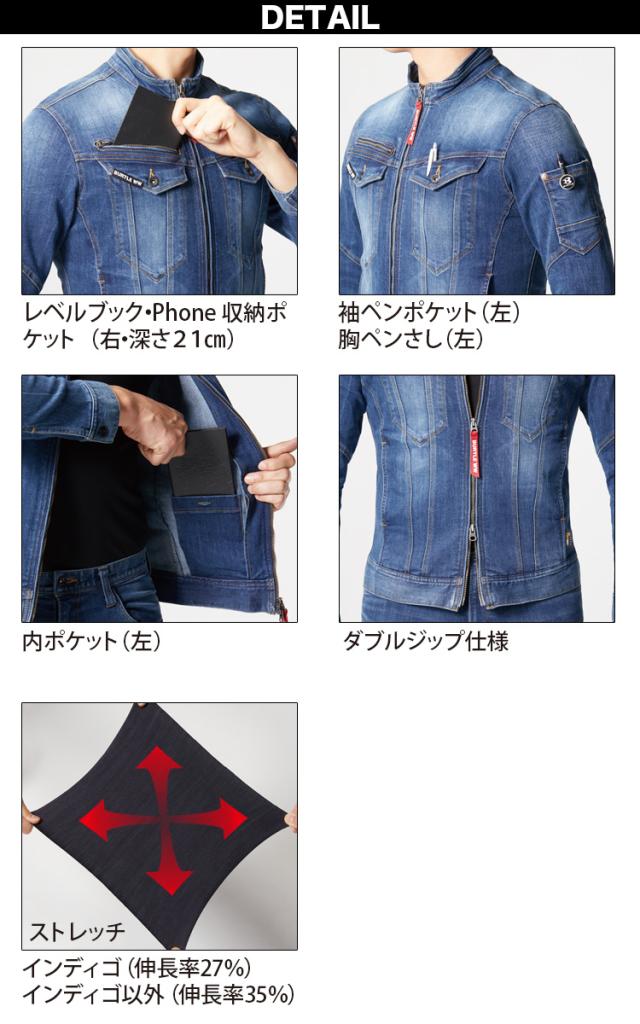 摩耗強度と耐久性に優れるコーデュラストレッチデニムを用いた細身なシルエットのダブルジップ仕様ジャケットとスリムテーパードカーゴパンツ。