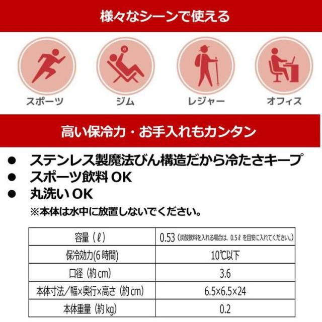 ●素材:内びん:ステンレス鋼 / 胴部:ステンレス鋼(アクリル樹脂塗装) / フタ:ポリプロピレン / せん本体:ポリプロピレン / フタパッキン:シリコーンゴム / せんパッキン:シリコーンゴム