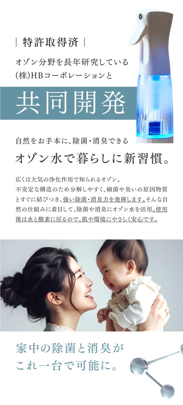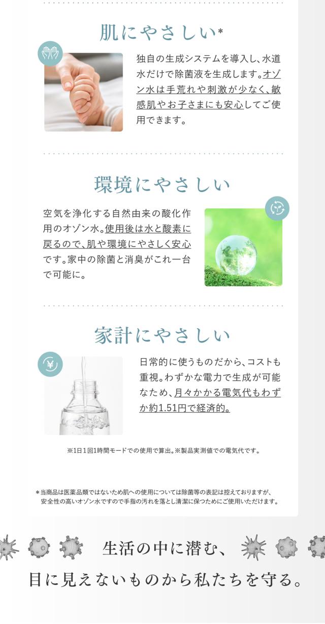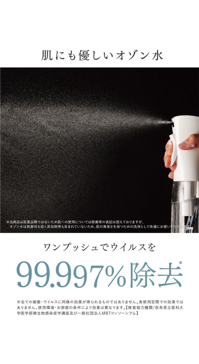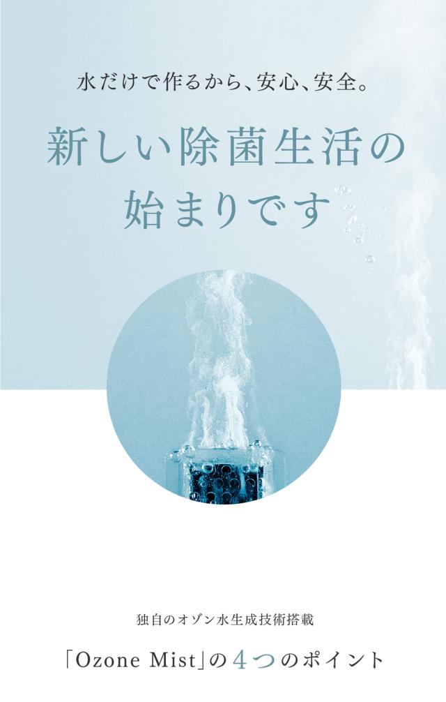 家庭用 オゾン水生成器 「Ozone Mist」。オゾンの力でウイルスを99.997%除去。身の回りの物から食品まで使えるオゾン除菌水。自然をお手本に、除菌・消臭できるオゾン水で暮らしに新習慣。
