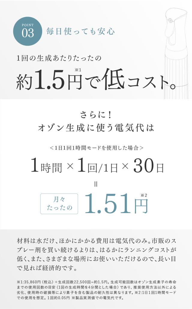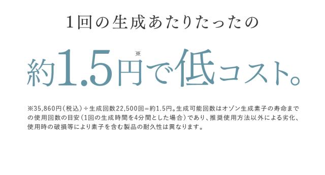※35,860円(税込)÷生成回数22,500回=約1.5円。生成可能回数はオゾン生成素子の寿命までの使用回数の目安(1回の生成時間を4分間とした場合)であり、推奨使用方法以外による劣化、使用時の破損等により素子を含む製品の耐久性は異なります。