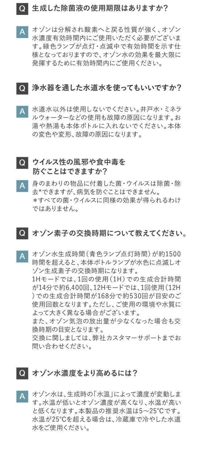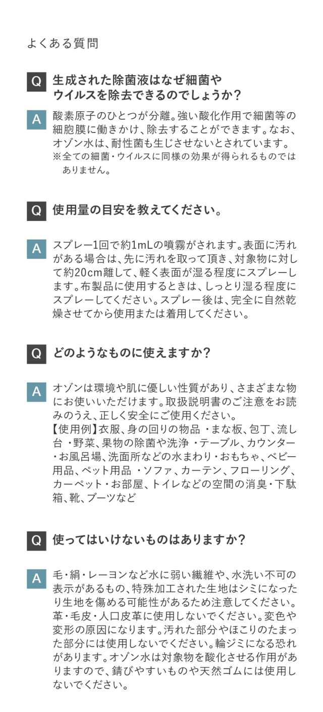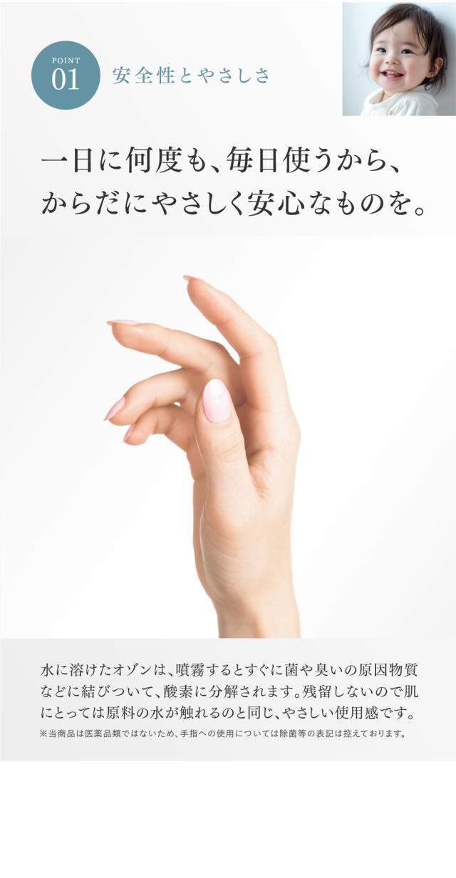 ※当商品は医薬品類ではないため、手指への使用については除菌等の表記は控えております。ただし、オゾン水は刺激性も低く添加物等も含まれていないため、素肌の清潔さを保つための洗浄として快適にお使いいただけます。