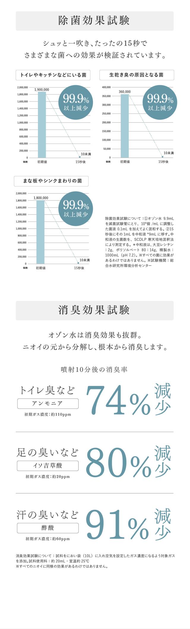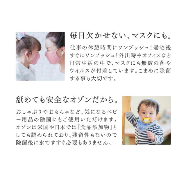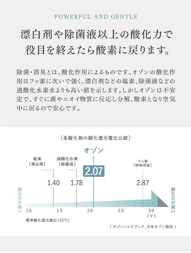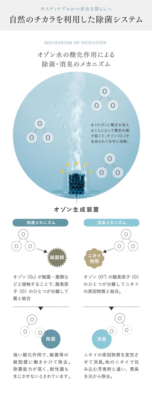 空気を浄化する自然由来の酸化作用のオゾン水。使用後は酸素に戻るので、肌や環境にやさしく安心です。オゾン水生成器・オゾン 脱臭機として、家中の除菌と消臭がこれ一台で可能に。