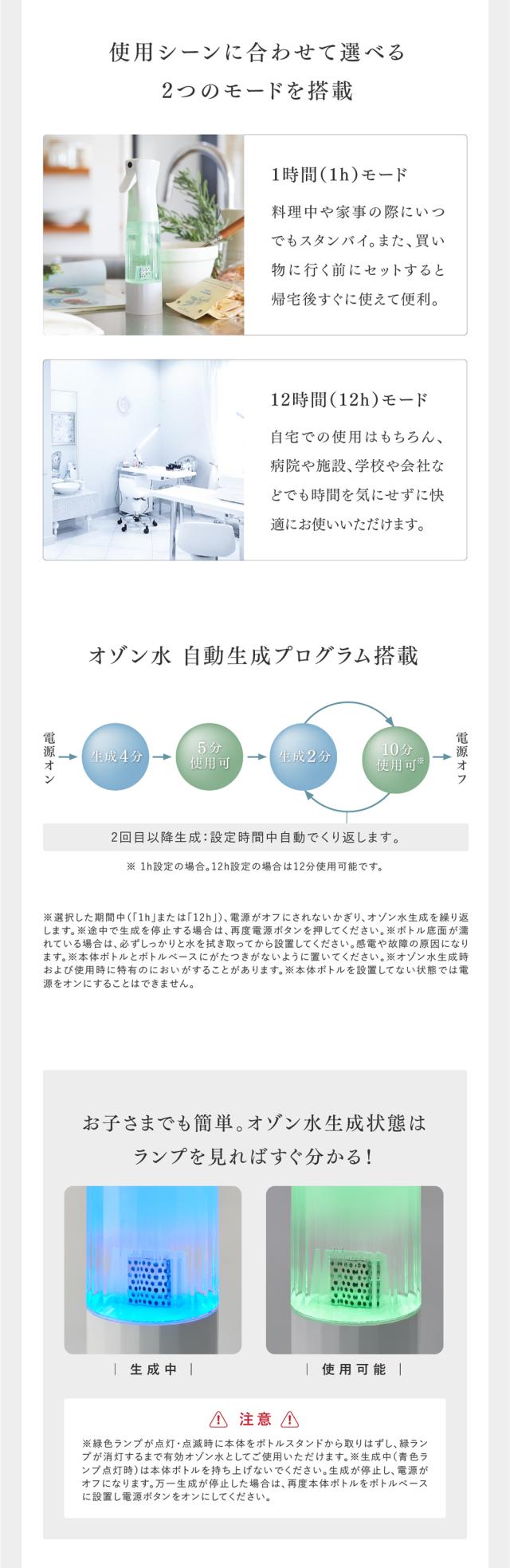 | ●オゾン濃度 | 初期濃度:1.0mg/L以上、有効時間中:0.5mg/L以上 測定条件:基準水・水温 20℃ |