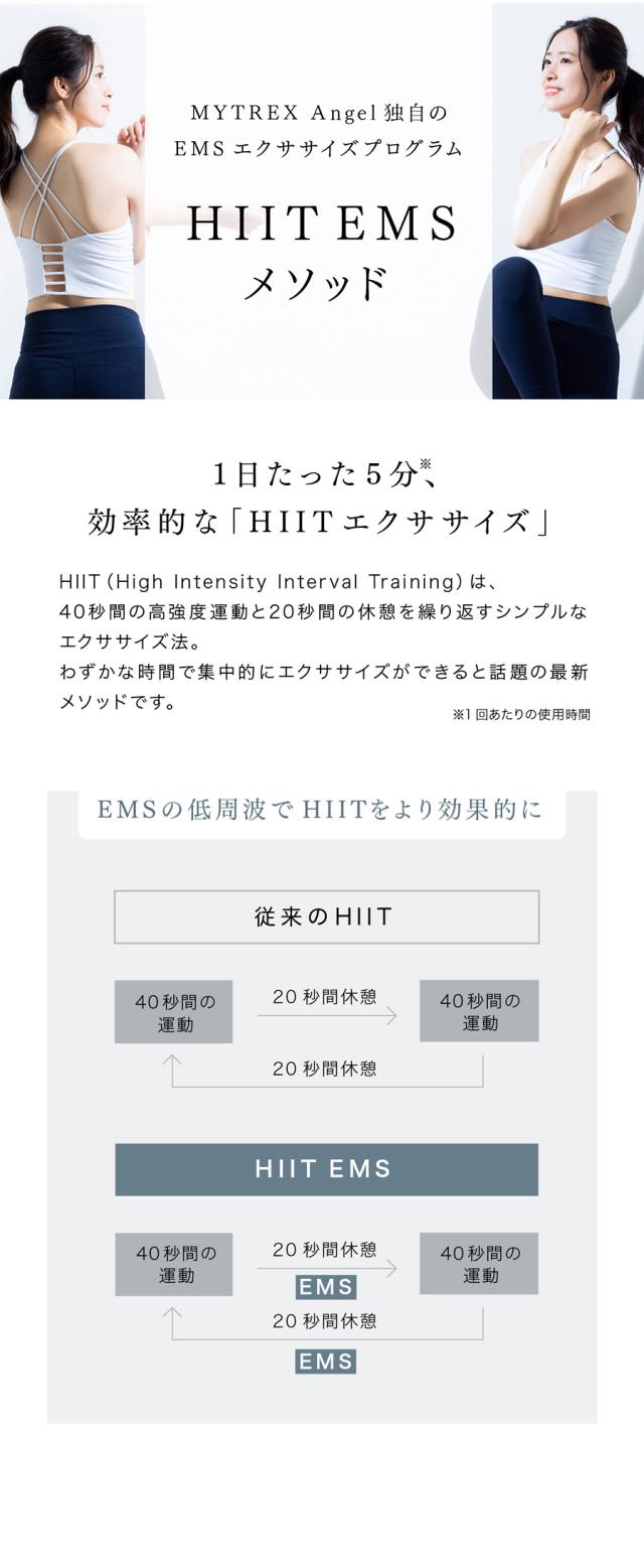 HIIT(高強度インターバールエクササイズ)は、40秒間の高強度の運動と20秒間の休憩を繰り返し実施する方法です。HIIT EMSは、このエクササイズ方法にEMS(電気的筋肉刺激)を加えたメソッドです。マイトレックス エンジェルの『HIIT Stlye』では、40秒間のエクササイズと20秒間のEMS電気刺激を繰り返すことで、効率よくエクササイズすることを目指します。