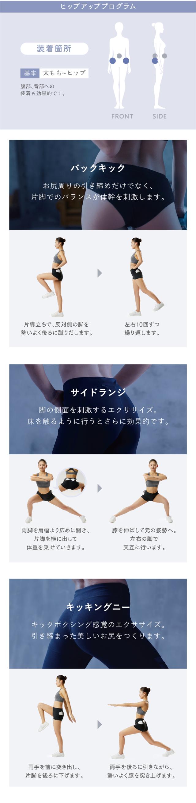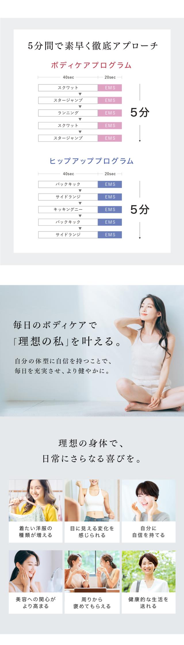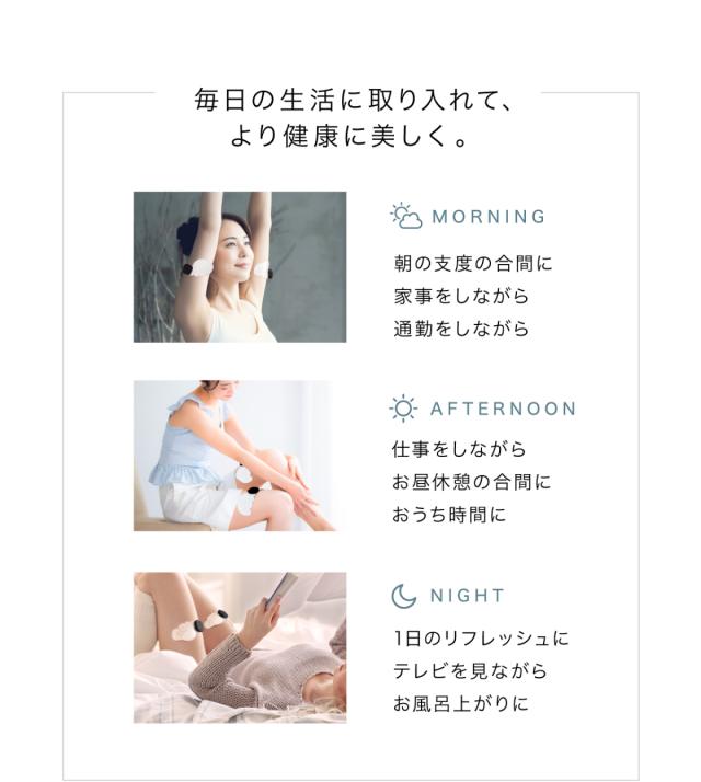 貼り付けるだけで手軽にケア。いつもの日常にエクササイズの新習慣。お任せでバランスよく筋肉を引き締める『Relax Style』と、1日たった5分のエクササイズを組み合わせる『HIIT Style』の2モードを搭載。