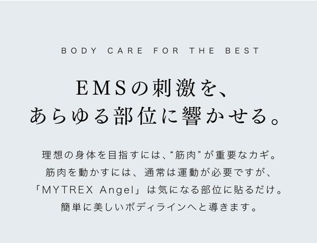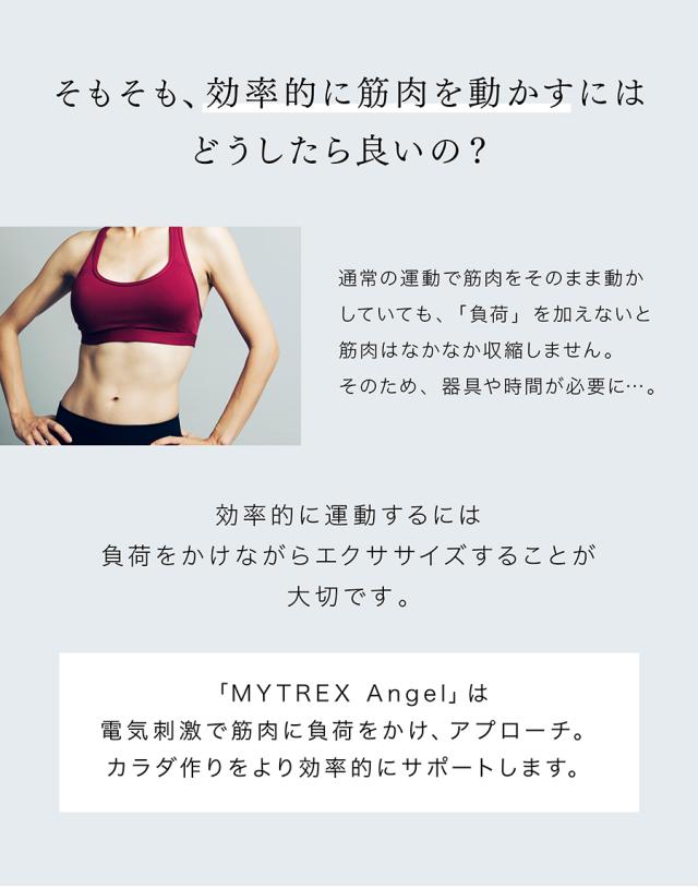 EMS(Electrical Muscle Stimulation=電気的筋肉刺激)とは、電気刺激によって筋肉を動かす運動法です。 運動神経に微弱な電量を流すことによって、「収縮」と「弛緩」を繰り返し、運動しているときと同じ状態を作ります。 MYTREX Angelで、いつでもどこでも、気軽にエクササイズ可能に。