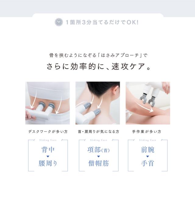 しつこい"コリ"を"ほぐす"ほどのピンポイント振動力で、"コリ"や"痛み"の原因となる固まった筋肉・癒着した筋膜を効果的にリリースします。