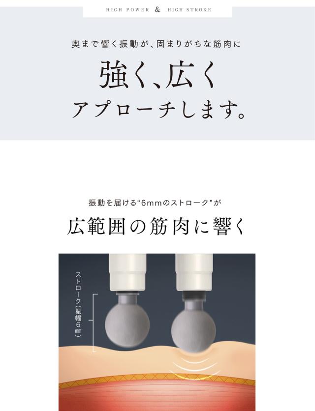 パワフルさの秘密は、6mmの振幅(ストローク)。このストロークが大きいほど、深くまで振動が伝わります。