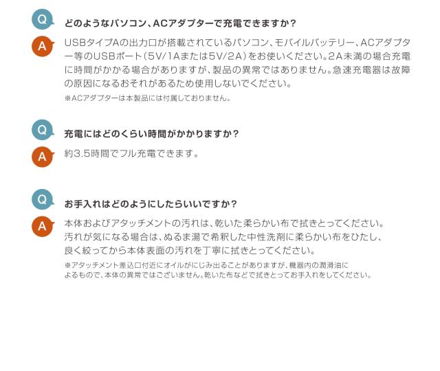 | ●パッケージ内容 | 本体×1・充電用USBコード×1・アタッチメント4種類×2・取扱説明書(保証書)×1・アタッチメント用ストッパーゴム(予備)×2 |
