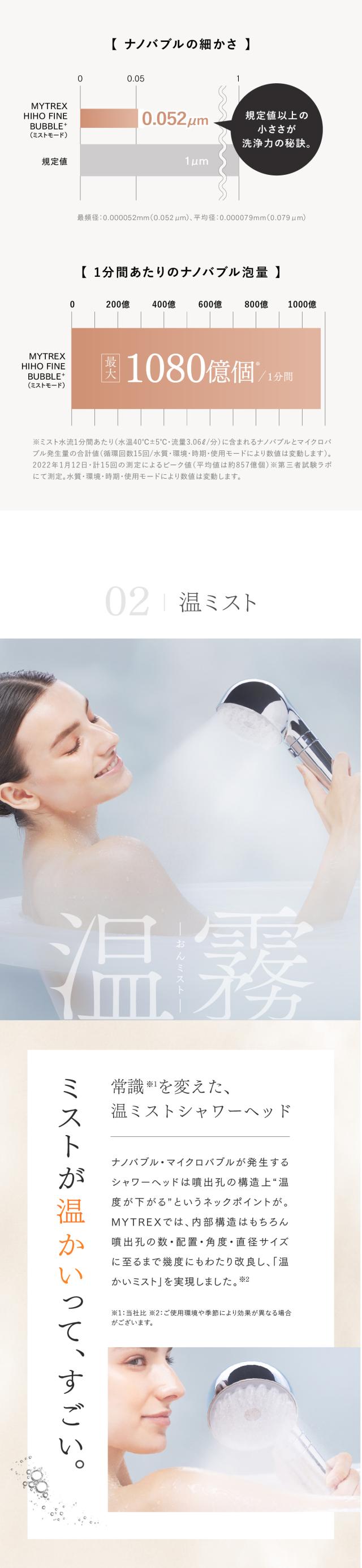 ※:ミスト水流1mlあたり(水温40℃±5℃・流量7.0L・循環回数15回/第三者試験ラボにて測定)に含まれるナノバブルとマイクロバブル発生量の合計値に基づき自社にて算出(水圧0.15MPa・流量3.06L/分の使用環境における推定値)。水質・環境・時期・使用モードにより数値は変動します。