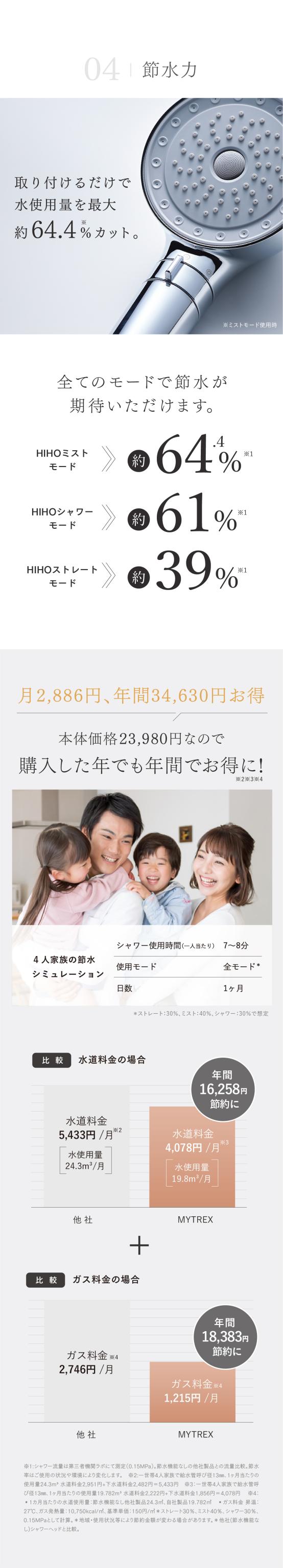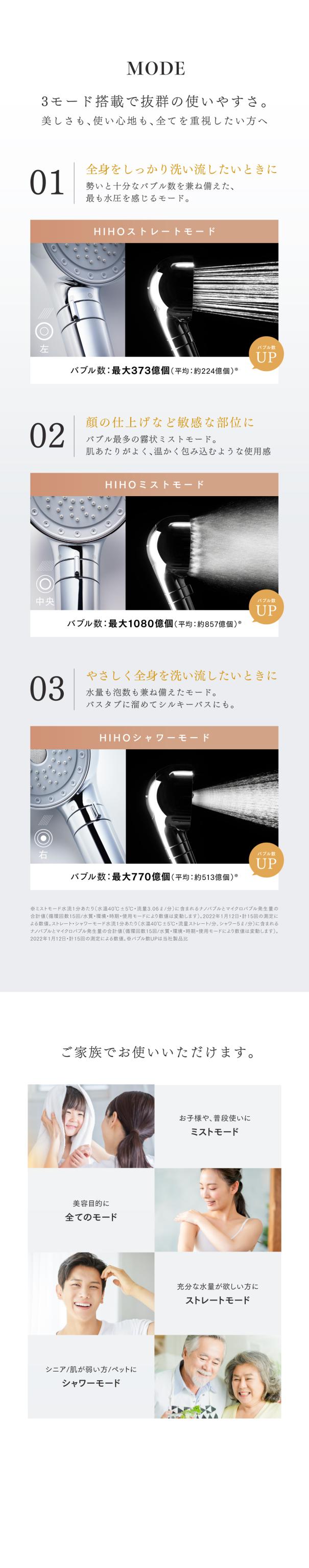 " HIHOストレートモード ":勢いと充分なバブル数を兼ね備えた、最も水圧を感じるモード、" HIHOミストモード ":バブル最多の霧状ミストモード、" HIHOシャワーモード ":水量も泡数も兼ね備えたモードの3つから目的に合わせてカスタマイズできます。