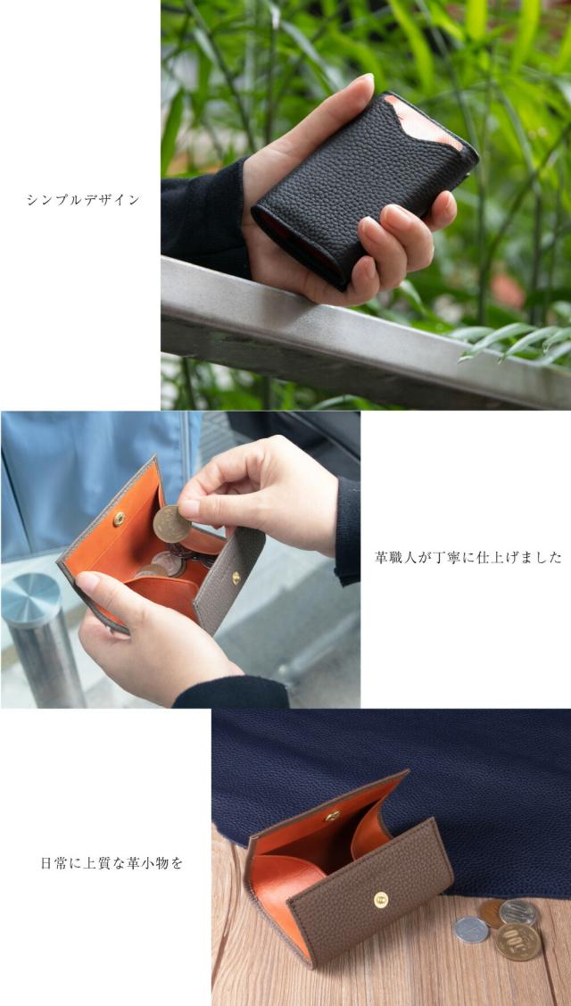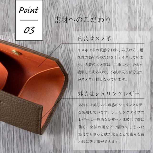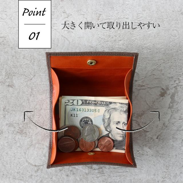 HANATORA手帳型ケースでお馴染みのシュリンクレザーを使用したカードポケット付きコインケースです。「そんなにカードを持ち歩かない」「お札も少量」「小銭が入れば十分」そんなお声を頂戴して余分な部分な部分をカットすることでシンプルコンパクトを実現しました。手に収まるサイズ感でボトムやコートのポケットにインが可能。取り出しやすい大きく開くコインケースに便利な外側のカードポケットカードポケットには電子マネーカードや定期券などをいれることもできるのでちょっとしたおでかけに便利です。