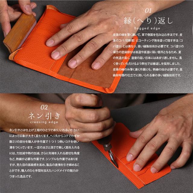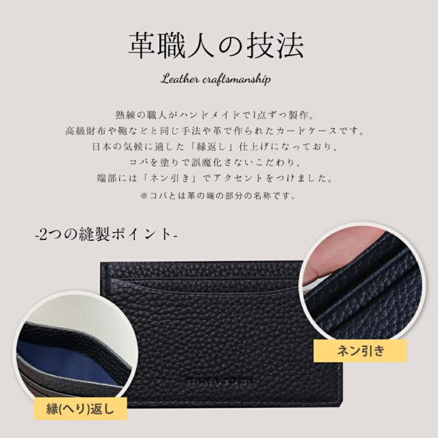 最高級の牛革を使用したシンプルかつ精巧な作りのカードケース。胸ポケットに収まる、実用性の高いコンパクトなサイズ感です。美しいレザーがカードで隠れないよう、フロントポケット以外は“深め“に設計してあります。やや大きめに作ったセンターのメインポケットには一般的な紙製の名刺であれば10枚は優に収納可能です。カードケースでありがちな、カードのデザインでケースが覆われてしまう事はありません。頻用するカードをすぐ見つけたい貴方のために、フロントの1ポケットのみ浅めのポケットで設計いたしました。用途に応じてそれぞれのポケットをご利用いただけます。なめらかな裏地でカードの出し入れもスムーズに行えます。ポケットはカーブポケット以外は「深め」かつ「広め」に設計。カーブポケット以外に収納したカードは見えないので、すっきりとスマートな印象に。