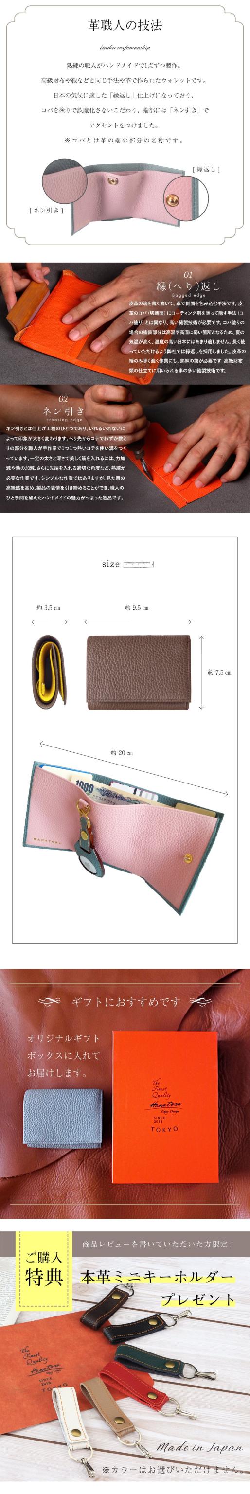 高級本革を贅沢に使用した三つ折りのコンパクトなお財布です。内装にも同レザーを使用し統一感を演出しております。バイカラーの配色とスマートかつ落ち着いたスタイルで、年齢やスタイルを問わずご利用いただけます。あえて小銭入れを付けないことでスッキリと可愛らしいフォルムに仕上げました。型崩れのしにくいコロンとしたデザインで、本革を多く使用しているにも関わらず軽量なのもポイントです。内部には鍵やAirTagケースを付けられるリングを装備しております。生産は全て職人のハンドメイドで。同レザーを使用した小銭入れも現在企画中です。オリジナルのギフトボックスにてお届けいたします。