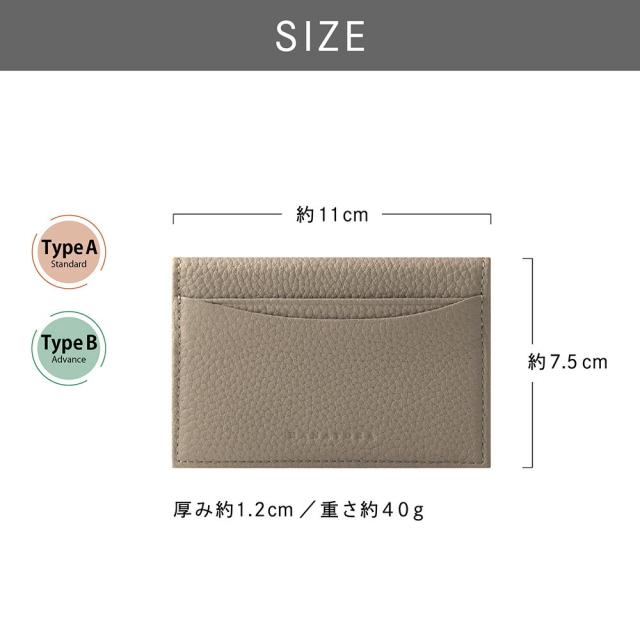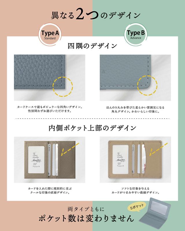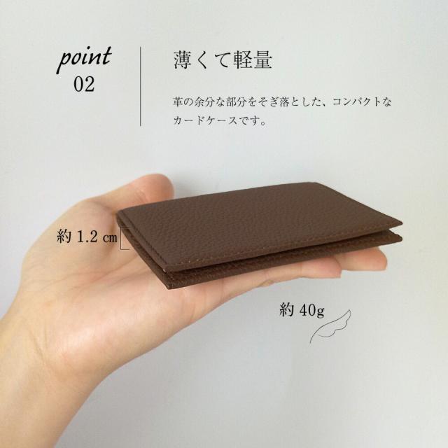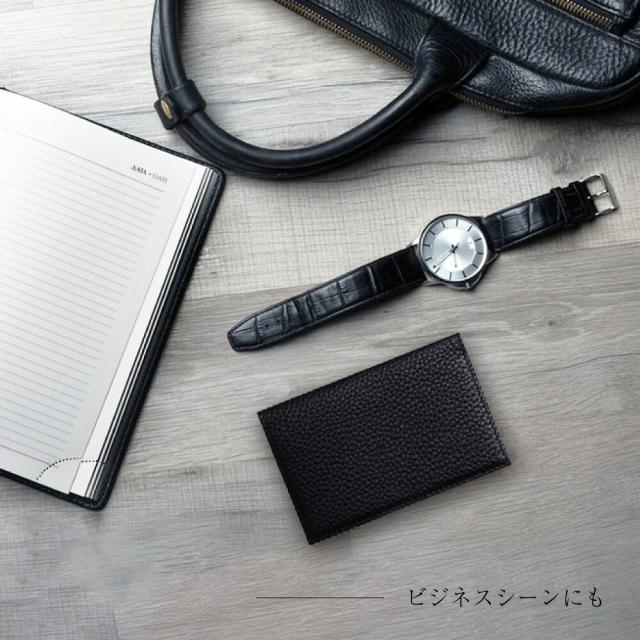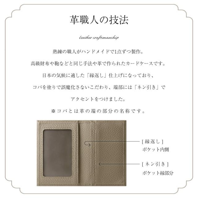 最高級の牛革を使用したシンプルかつ精巧な作りのカードケース。胸ポケットに収まる、実用性の高いコンパクトなサイズ感です。用途に応じてそれぞれのポケットをご利用いただけます。外側も内側も全て同一のレザーで美しい統一感を演出いたしました。なめらかな裏地でカードの出し入れもスムーズに行えます。ポケットはカーブポケット以外は「深め」かつ「広め」に設計。カーブポケット以外に収納したカードは見えないので、すっきりとスマートな印象に。