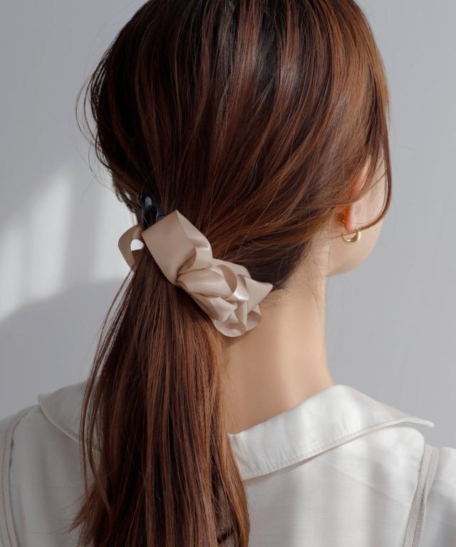 サテン調のリボンが艶めき、うしろ姿を品のある女性らしい雰囲気に導くバナナクリップ。