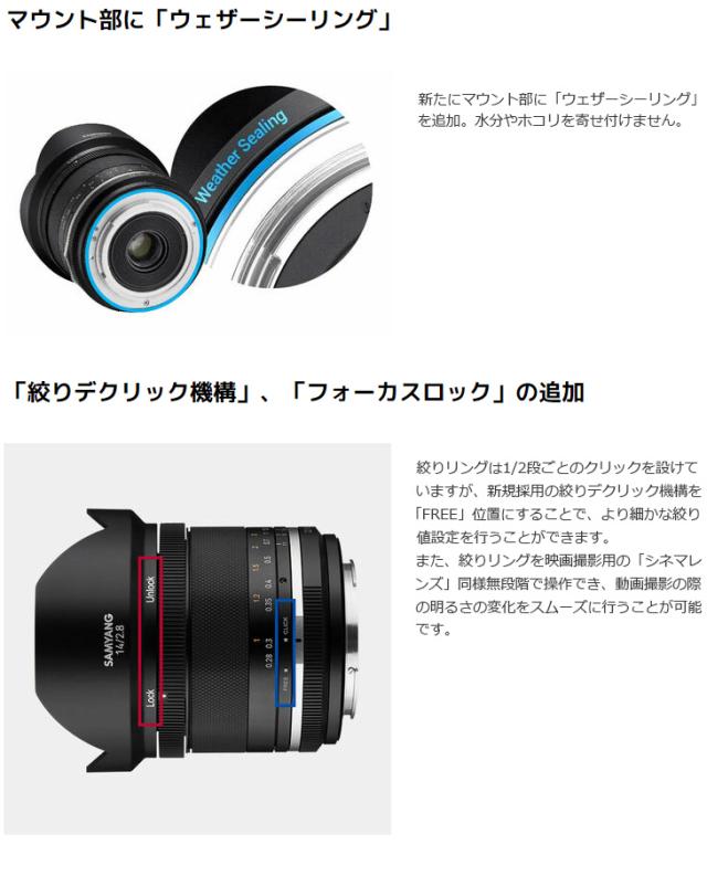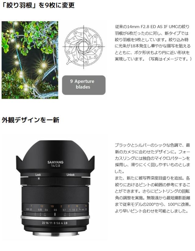 SAMYANGのベストセラーであるマニュアルフォーカスの「14mm F2.8」がリニューアル。