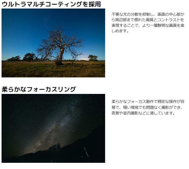 また、最新技術の無反射コーティングのウルトラマルチコーティングが施され、フレアとゴーストを最小化します。