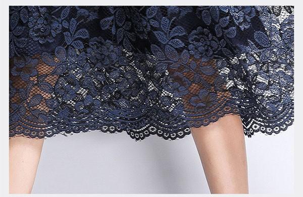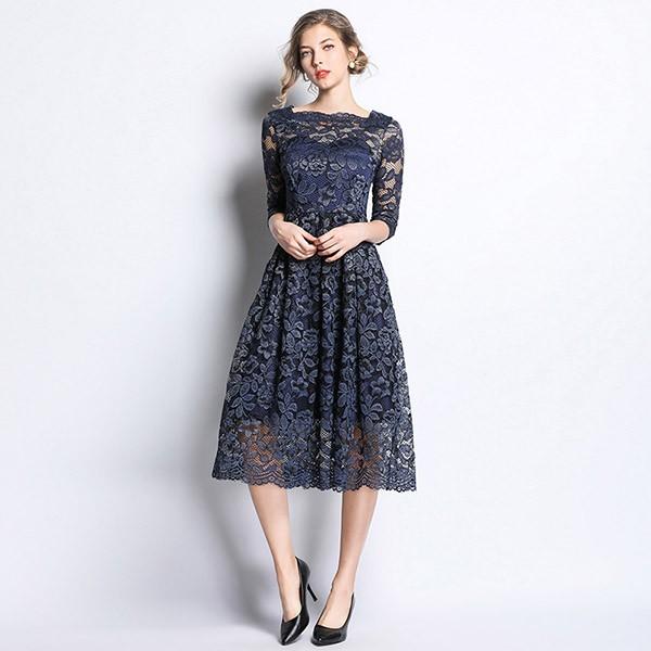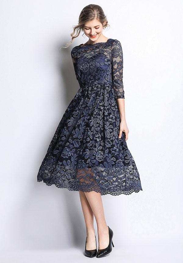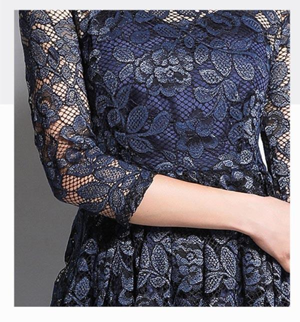 結婚式ワンピース パーティードレス 袖あり フォーマル 大きいサイズ お呼ばれ デート 総レース 膝下 ゆったり aライン フォーマルドレス 春 夏 秋 冬 パーティドレス 着痩せ 他と被らない 大人 上品 ネイビーdb034s1s1c9