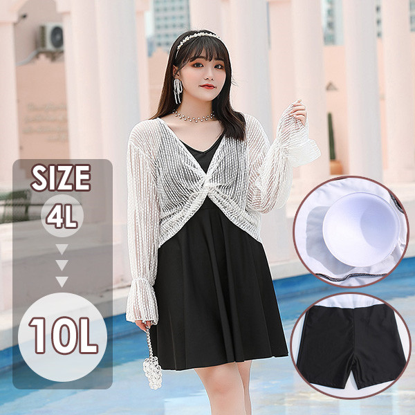 水着 レディース ワンピース 体型カバー 大きいサイズ6XL 7XL 8XL 9XL オトナ女子 韓国風 セクシー かわいい 可愛い 黒 ブラック シースルー 袖あり フリル レースアップ ぽっちゃり ビーチ プール 海 水泳 df018d4d4c9