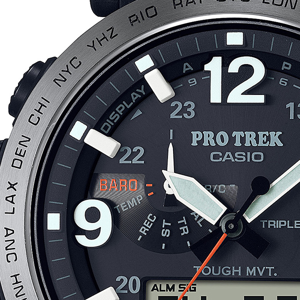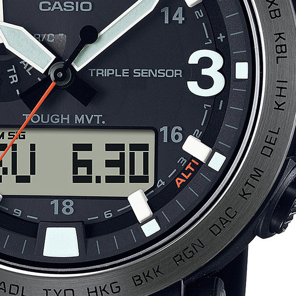 腕なじみの良い装着性と高い視認性はそのままに、ケースとバンド、裏蓋にバイオマスプラスチックを使用しています。ソフトウレタンバンドにはターゲットガイドを採用し、秒針の示す方角の判読性を高め、より方位が分かりやすい機能美あるデザインに。また文字板には、みやすいアラビック文字とバーインデックスを採用し、視認性を高めています。都市コードを刻んだステンレスベゼルが、アウトドアギアらしい表情を醸し出します。マルチバンド6やタフソーラーなども搭載し、様々なシーンで対応する高い機能性と実用性を追求しました。