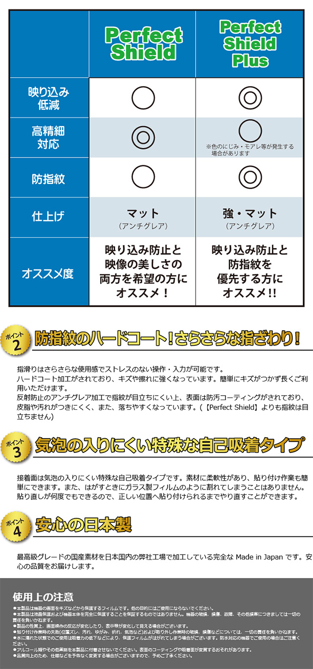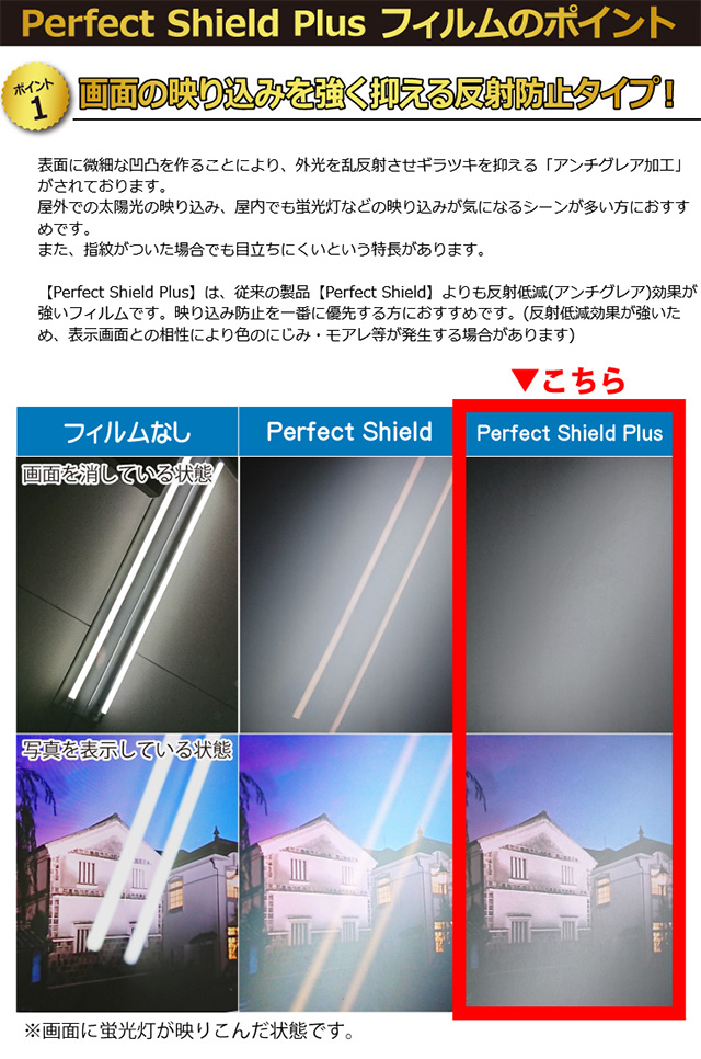 【Perfect Shield Plus】は、従来の製品【Perfect Shield】よりも反射低減(アンチグレア)効果が強いフィルムです。映り込み防止を一番に優先する方におすすめです。(反射低減効果が強いため、表示画面との相性により色のにじみ・モアレ等が発生する場合があります)