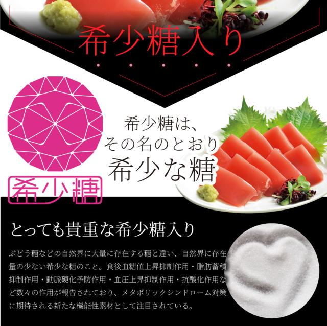 醤油(国内製造)、希少糖含有シロップ、味醂、こんにゃく精粉(国産)、つゆ(醤油、食塩、砂糖、その他)、食塩、砂糖、魚醤(魚介類)、醸造酢、魚介エキス(魚介類)、果糖ぶどう糖液糖、昆布エキス、黒糖蜜(黒糖、原料糖、液状ぶどう糖)、酵母エキス/加工澱粉、酸味料、調味料(有機酸等)、乳酸カルシウム、増粘剤(加工澱粉)、酸化防止剤(V.C)、アルコール、トマト色素、結晶セルロース、イカスミ色素、カロチン色素、(一部に大豆・小麦・魚醤(魚介類)・魚介エキス(魚介類)・いかを含む)