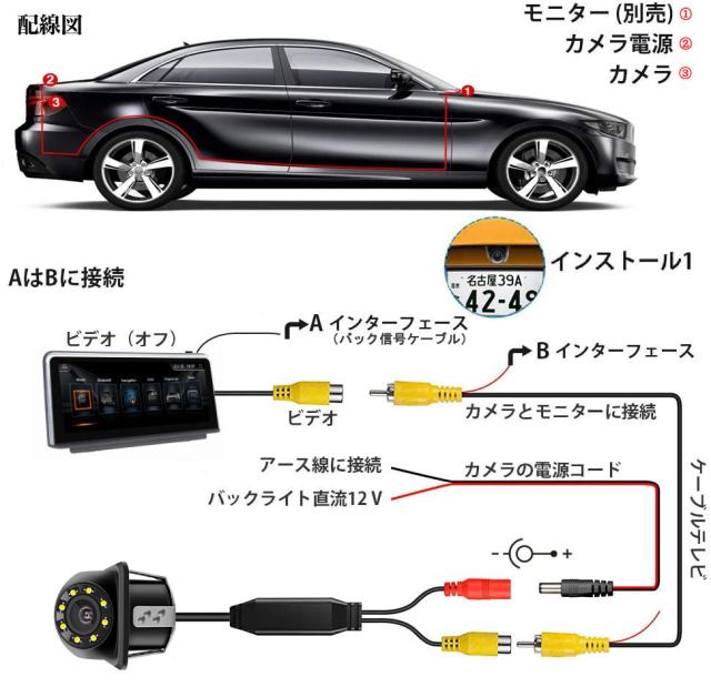 ◇リアカメラのケーブルに2本の連動線が付いています。赤線をバックランプの+側に、黒線を−側に接続したら、バックする時、ガイドラインが表示されるので、車庫入れをサポートできます。バック連動機能を使わない場合は、この連動線を接続する必要はないです。