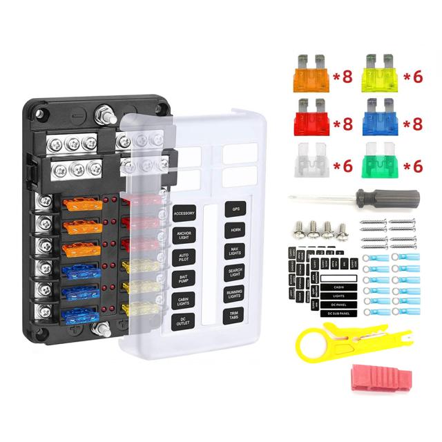 1 * 12方向ヒューズボックス、1 *保護カバー、42 *ヒューズ、12 *接続端子、2 *ラベルステッカー、4 *短いネジ、4 *長いネジ、1 *ドライバー、1 *ワイヤーストリッパー、1 *ヒューズプラー