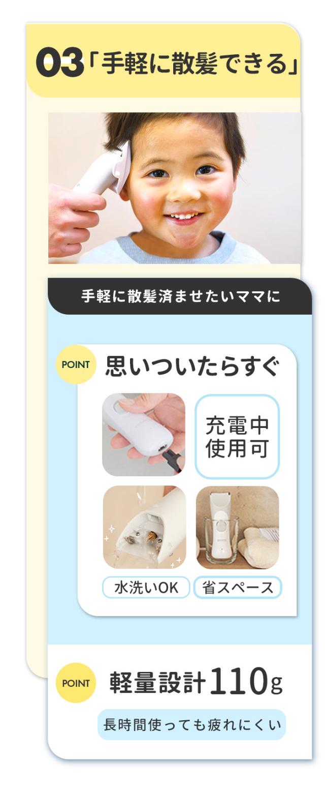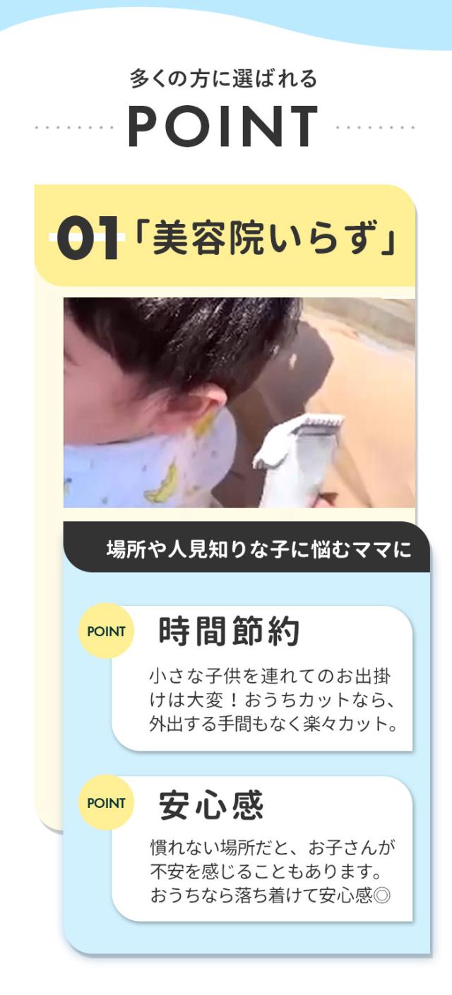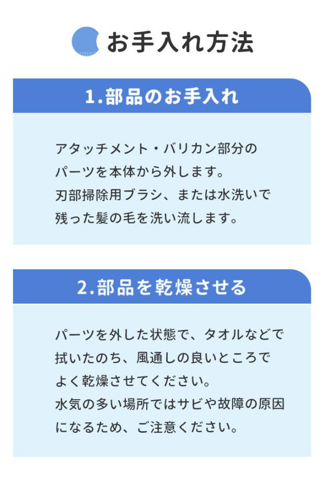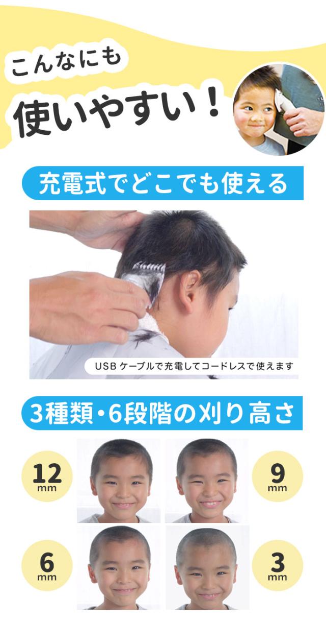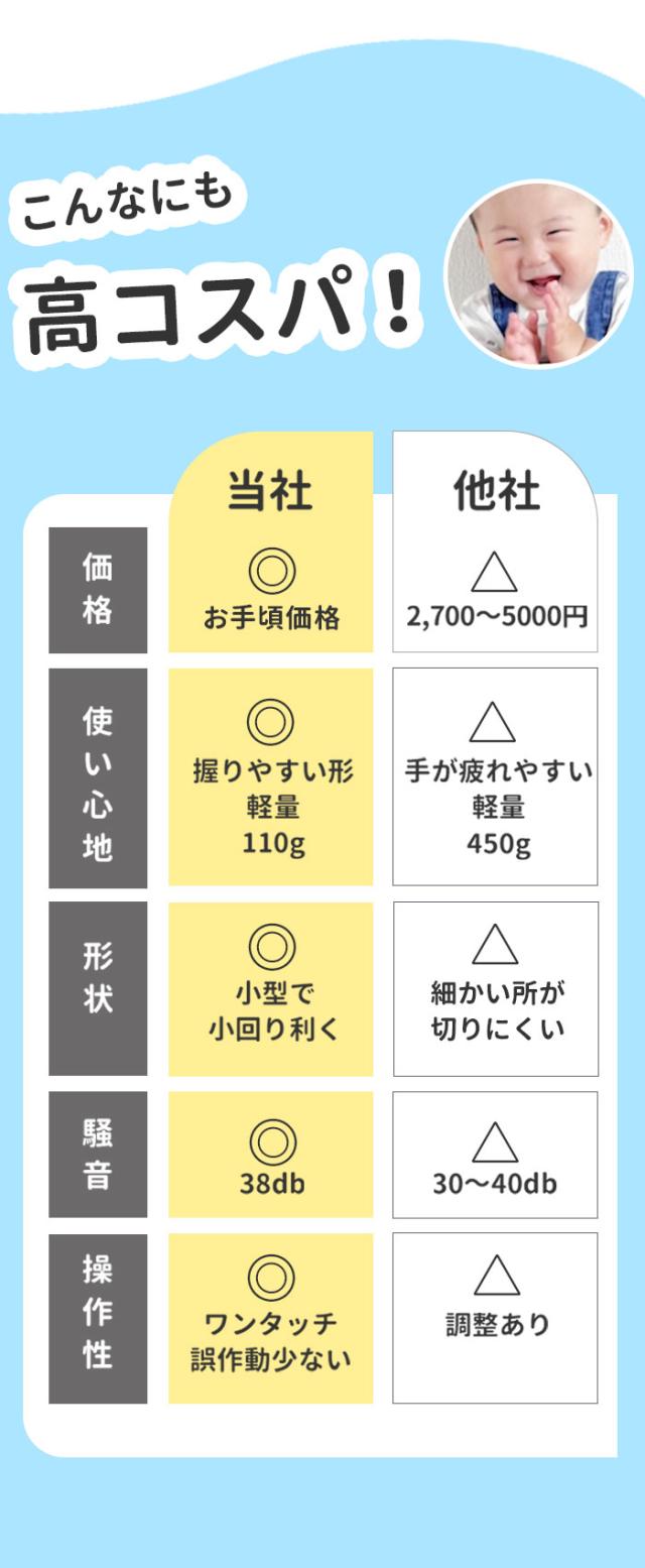 | 注意点 | [対象月年齢]生後6か月から [電源] ・定格出力:5V1A ・本体:ニッケル水素電池 [充電時間]6時間(フル充電) [連続充電限度]7時間まで [使用時間]約45分 [定格電圧]DC5V、50/60Hz [消費電力]交流使用時・充電式使用時約5W [コード長さ]70cm ※ACアダプタは付属していません。 ※縮れた髪質の方やパーマをかけている場合はお使いいただけません。 ※IPX7基準(水深1メートルに30分間水に浸けても有害な影響を生じる量の水の浸入がない)検査をクリアしていますが、充電差込口と電源スイッチは除きます。 ※充電しながらの水洗いや、お風呂など水がかかる場所でのご使用は絶対におやめください。 ※用途目的以外でのご使用はおやめください。故障やケガの原因となります。 ※浴室など水気の多い場所でのご使用はおやめください。故障や感電の原因となります。 ※以下のような場所での使用や保管はおやめください。感電、故障、火災の原因となります。 ・極端に高温、低温な場所(0度〜40度の範囲内でご使用ください) ・温度変化が激しい場所(結露が発生するおそれがある場所) ・浴室など水気の多い場所、湿度が高い場所や水がかかる場所 ・暖房器具や調理器具など熱源の近く、ガソリン、ベンジン、シンナーなど、引火性のものの近く ※分解・修理・改造はおやめください。感電、火災、ケガ、故障の原因となります。 ※付属のUSBケーブルをご使用ください。同等規格以外のUSBケーブルはご使用をおやめください。感電・発火・故障の原因となります。 ※USBケーブルは破損しないよう丁寧に取り扱ってください。感電や火災の原因となります。 ・傷つけない ・加工しない ・熱源に近づけない ・無理に曲げたり、引っ張ったり、ねじったり、束ねたりしない ・重いものを載せない ・尖った場所、挟まるような場所に置かない ・濡れた手で触らない ※USBケーブルや充電差込口が破損及び損傷している場合はご使用をおやめください。感電や火災の原因となります。 ※USBケーブルや充電差込口についた埃や髪の毛は、定期的に乾いた布で拭きとってください。埃がたまるとショートして火災の原因となります。 ※使用時・充電時以外はUSBケーブルをACアダプタから抜いてください。火災や器物損傷の原因となります。 ※蓄電池が液漏れしたり異臭がしたりするときは使用しないでください。火災や器物破損の原因となります。 ※お子様や介護の必要な方だけでのご使用はおやめください。 ※故障やケガの原因となります。 ※お子様の手の届くところに保管しないでください。ケガや破損の原因となります。 ※お子様が製品の近くにいるときは目を離さないでください。 ※落とす・ぶつけるなど本製品に強い衝撃を与えないでください。破損や故障の原因となります。 ※本製品の上に物を載せないでください。落下・破損などの原因となります。 ※異音・異臭・発煙・損傷などの異常を感じたら、すぐに電源を切ってください。そのまま使用すると、火災・感電・ケガのおそれがあります。 ※15分以上連続して使用しないでください。刃に摩擦熱が発生し、皮膚を傷つける可能性があります。 ※刃部用オイルは刃部専用のため、ほかの用途には使用しないでください。故障や破損の原因となります。 ※長時間使用しない場合は、半年に一度満充電にしてください。長期間電池がない状態が続くと、蓄電池の寿命を短くする原因となります。 ※本体および付属品はお子様の手の届かないところに保管してください。オイルなどを飲み込んだ場合は、病院や医師にご相談ください。 ※肌に異常がある方やアレルギー体質の方はご使用をおやめください。 ※またケガをしている部分や吹き出物がある部分に触れないようご注意ください。肌が荒れたり、症状が悪化したりするおそれがあります。 ※カメラやモニターの性質により、画像と実物の色の違いがある場合がございますのでご理解願います。 |