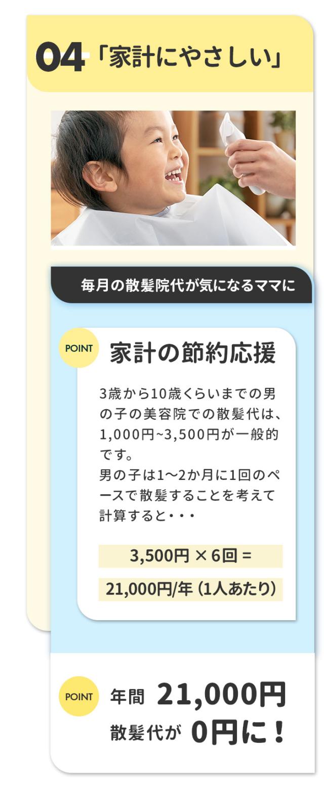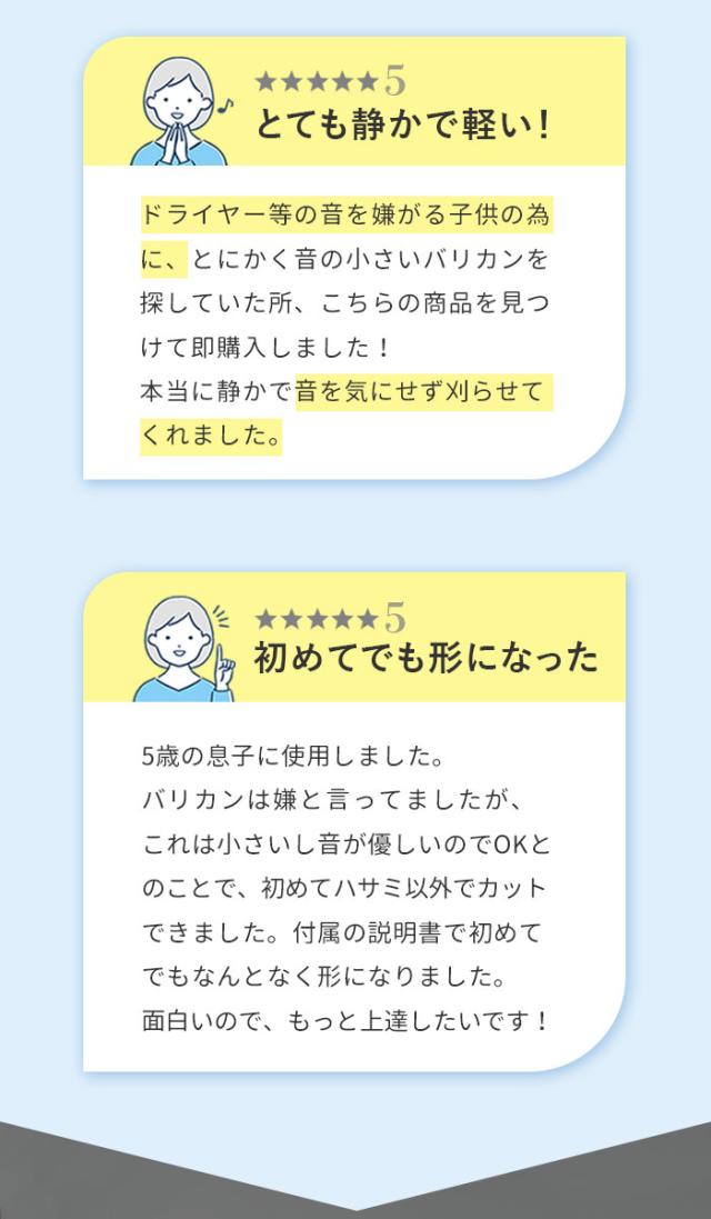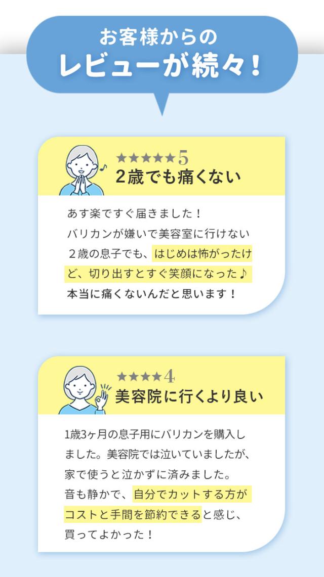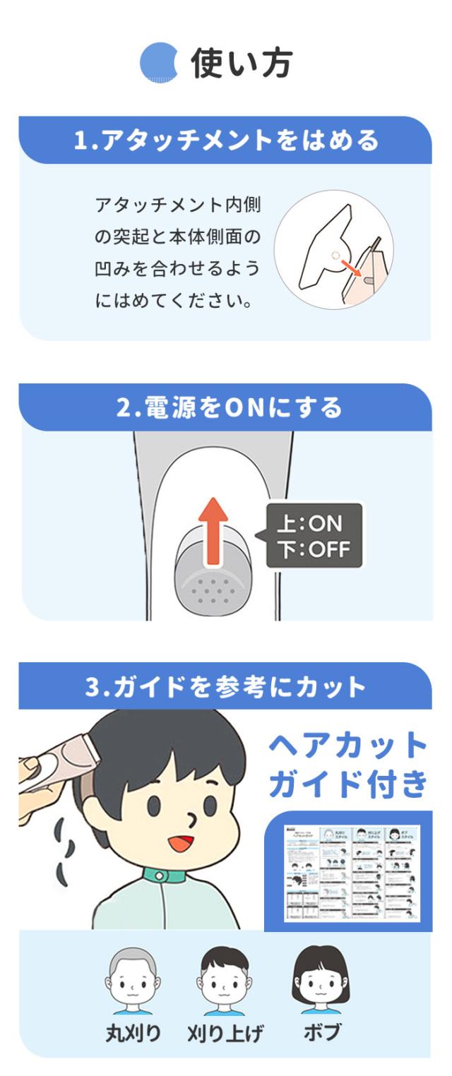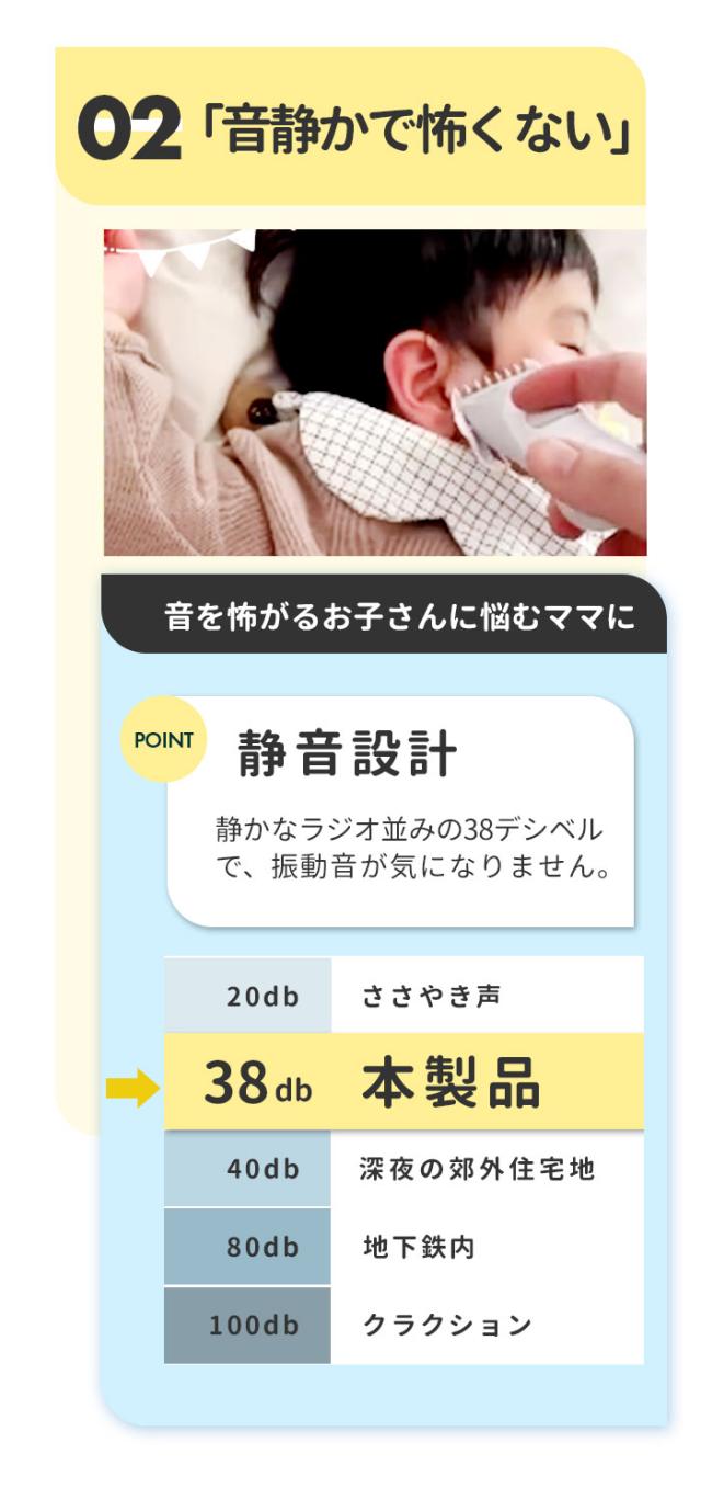 | 注意点 | [対象月年齢]生後6か月から [電源] ・定格出力:5V1A ・本体:ニッケル水素電池 [充電時間]6時間(フル充電) [連続充電限度]7時間まで [使用時間]約45分 [定格電圧]DC5V、50/60Hz [消費電力]交流使用時・充電式使用時約5W [コード長さ]70cm ※ACアダプタは付属していません。 ※縮れた髪質の方やパーマをかけている場合はお使いいただけません。 ※IPX7基準(水深1メートルに30分間水に浸けても有害な影響を生じる量の水の浸入がない)検査をクリアしていますが、充電差込口と電源スイッチは除きます。 ※充電しながらの水洗いや、お風呂など水がかかる場所でのご使用は絶対におやめください。 ※用途目的以外でのご使用はおやめください。故障やケガの原因となります。 ※浴室など水気の多い場所でのご使用はおやめください。故障や感電の原因となります。 ※以下のような場所での使用や保管はおやめください。感電、故障、火災の原因となります。 ・極端に高温、低温な場所(0度〜40度の範囲内でご使用ください) ・温度変化が激しい場所(結露が発生するおそれがある場所) ・浴室など水気の多い場所、湿度が高い場所や水がかかる場所 ・暖房器具や調理器具など熱源の近く、ガソリン、ベンジン、シンナーなど、引火性のものの近く ※分解・修理・改造はおやめください。感電、火災、ケガ、故障の原因となります。 ※付属のUSBケーブルをご使用ください。同等規格以外のUSBケーブルはご使用をおやめください。感電・発火・故障の原因となります。 ※USBケーブルは破損しないよう丁寧に取り扱ってください。感電や火災の原因となります。 ・傷つけない ・加工しない ・熱源に近づけない ・無理に曲げたり、引っ張ったり、ねじったり、束ねたりしない ・重いものを載せない ・尖った場所、挟まるような場所に置かない ・濡れた手で触らない ※USBケーブルや充電差込口が破損及び損傷している場合はご使用をおやめください。感電や火災の原因となります。 ※USBケーブルや充電差込口についた埃や髪の毛は、定期的に乾いた布で拭きとってください。埃がたまるとショートして火災の原因となります。 ※使用時・充電時以外はUSBケーブルをACアダプタから抜いてください。火災や器物損傷の原因となります。 ※蓄電池が液漏れしたり異臭がしたりするときは使用しないでください。火災や器物破損の原因となります。 ※お子様や介護の必要な方だけでのご使用はおやめください。 ※故障やケガの原因となります。 ※お子様の手の届くところに保管しないでください。ケガや破損の原因となります。 ※お子様が製品の近くにいるときは目を離さないでください。 ※落とす・ぶつけるなど本製品に強い衝撃を与えないでください。破損や故障の原因となります。 ※本製品の上に物を載せないでください。落下・破損などの原因となります。 ※異音・異臭・発煙・損傷などの異常を感じたら、すぐに電源を切ってください。そのまま使用すると、火災・感電・ケガのおそれがあります。 ※15分以上連続して使用しないでください。刃に摩擦熱が発生し、皮膚を傷つける可能性があります。 ※刃部用オイルは刃部専用のため、ほかの用途には使用しないでください。故障や破損の原因となります。 ※長時間使用しない場合は、半年に一度満充電にしてください。長期間電池がない状態が続くと、蓄電池の寿命を短くする原因となります。 ※本体および付属品はお子様の手の届かないところに保管してください。オイルなどを飲み込んだ場合は、病院や医師にご相談ください。 ※肌に異常がある方やアレルギー体質の方はご使用をおやめください。 ※またケガをしている部分や吹き出物がある部分に触れないようご注意ください。肌が荒れたり、症状が悪化したりするおそれがあります。 ※カメラやモニターの性質により、画像と実物の色の違いがある場合がございますのでご理解願います。 |