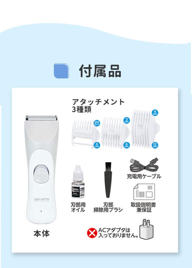 電気バリカン ベビー お手入れ簡単 アタッチメント3種 掃除用ブラシ 刃部用オイル アタッチメント3種 0mm 3mm 6mm 9mm 12mm