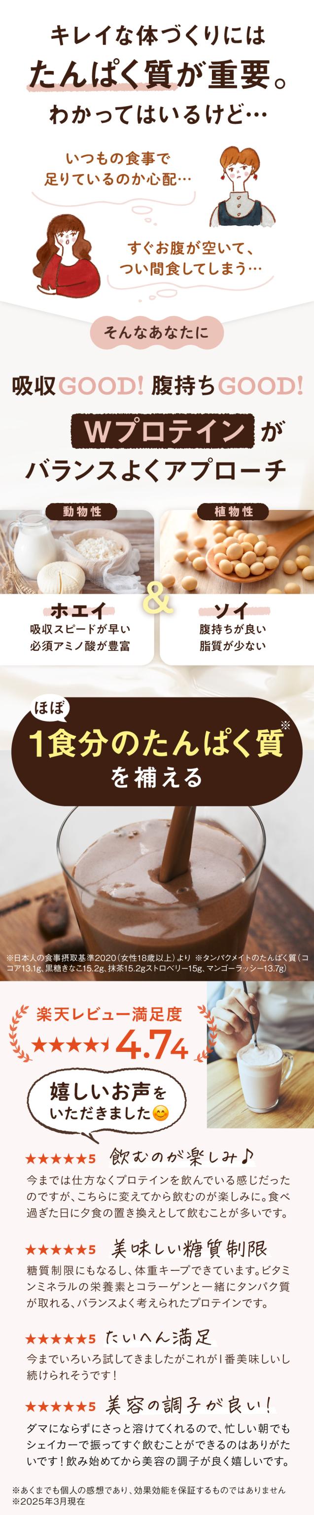 濃厚なココア味はまるでスイーツのような美味しさ。さらにクランチクッキーで驚きの飲みごたえ&満足感!黒糖きな粉、玉露抹茶、ストロベリーヨーグルトに加え、マンゴーラッシー風味が増えました!うまくいかないダイエットも、1日の食事のうちの1食分を置き換えるだけでお手軽に置き換えダイエット食品に!