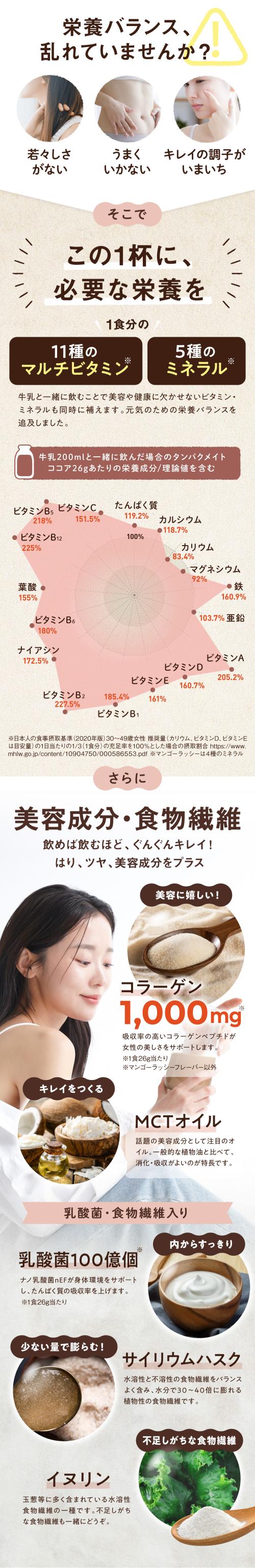 ■【キレイのための美容素材】乳酸菌 100億個・食物繊維・コラーゲン 1000mg(※マンゴーラッシー以外)・サイリウムハスク・MCTオイル 配合。(1食26gあたり)