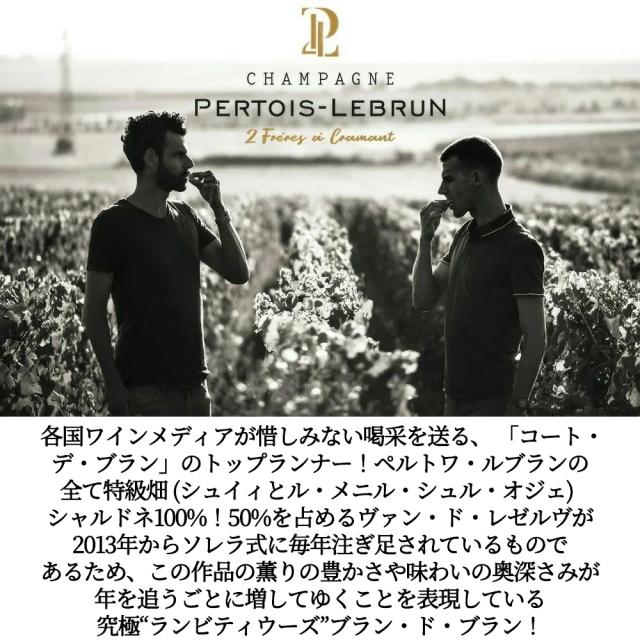 各国ワインメディアが惜しみない喝采を送る、 「コート・デ・ブラン」のトップランナー!ペルトワ・ルブランの全て特級畑 (シュイィとル・メニル・シュル・オジェ) シャルドネ100%!50%を占めるヴァン・ド・レゼルヴが2013年からソレラ式に毎年注ぎ足されているものであるため、この作品の薫りの豊かさや味わいの奥深さみが年を追うごとに増してゆくことを表現している究極“ランビティウーズ”ブラン・ド・ブラン!