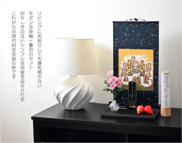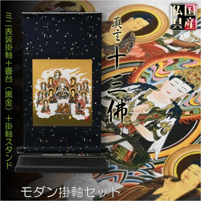 国産仏具・お盆飾り【真言十三仏・モダン掛軸セット:ミニ表装掛軸+畳台(黒金)+掛軸スタンド】卓上掛軸 十三佛絵像 掛軸 仏像 お盆用品 送料無料