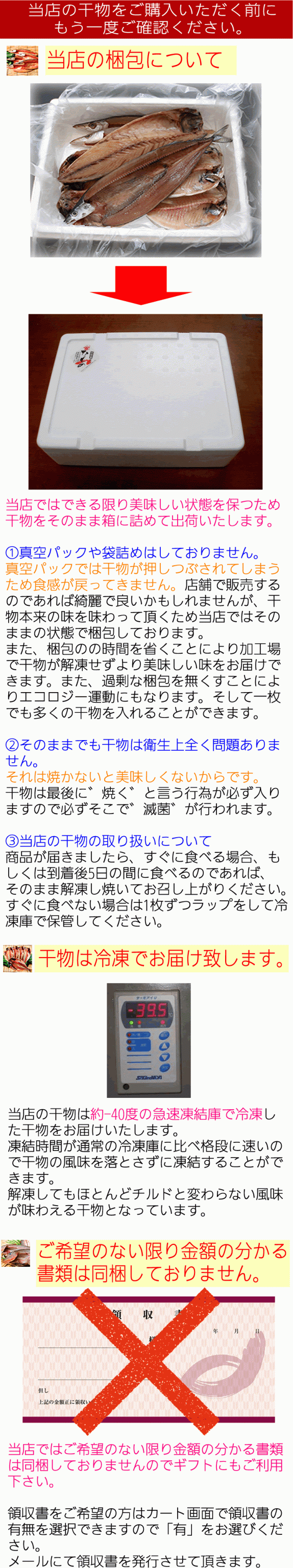 単品の干物を同時に同場所に送る場合は 送料が無料となります。 送料無料の干物セットも5枚から お買い求め頂けますので これに何枚か足してオリジナルの 干物セットを送るのもアリです! 当店ではあまり近くでは販売していない ちょっと珍しい干物も作っていますので これを何枚か足してギフトにすると 「食べたことの無い干物だけど美味かった!」 と感動されるかもしれません。 |